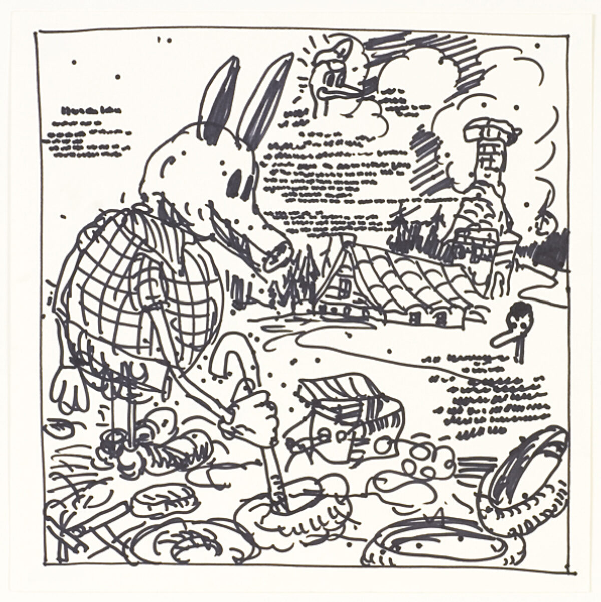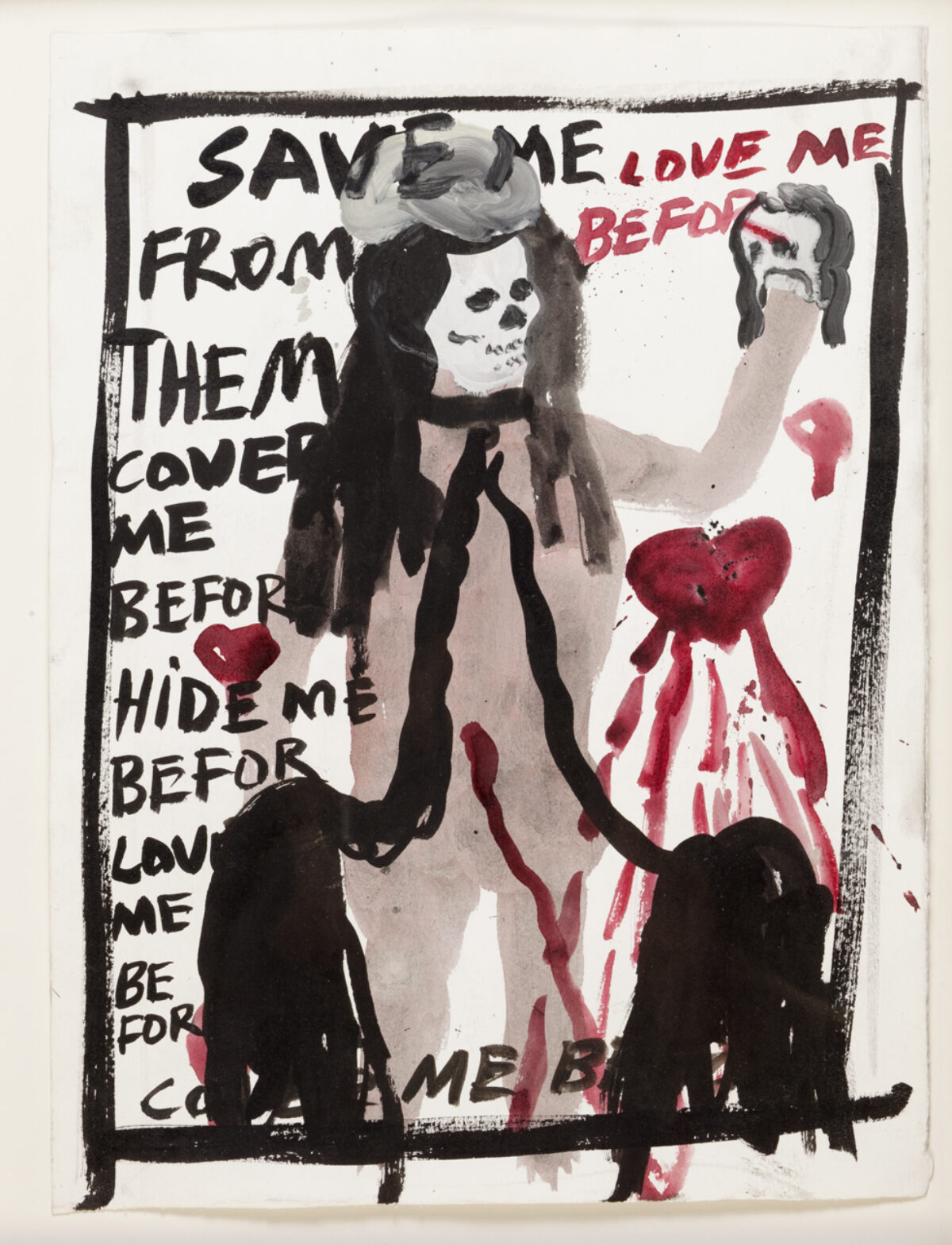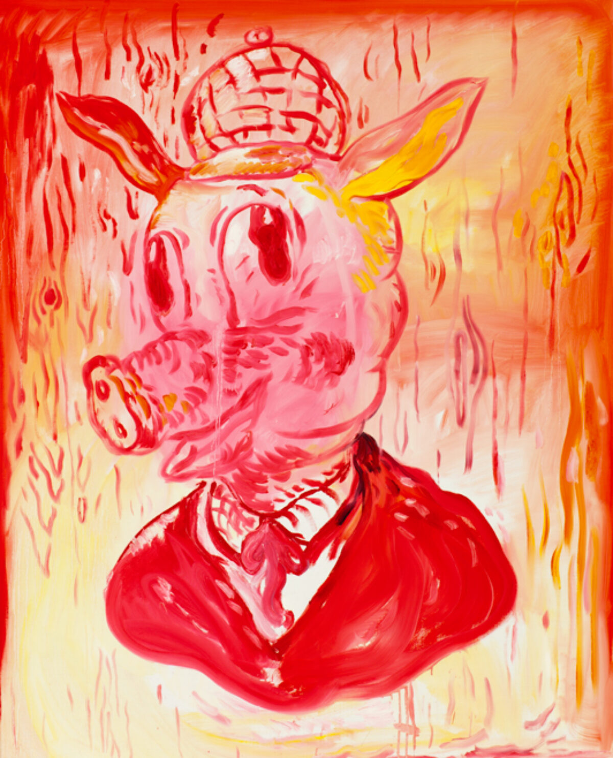 In such a way, the passionately emerging paintings move in their peculiar grotesqueness between the tragedy of the Spanish artist Francisco de Goya and the banality of American artist Philip Guston, who Eloyan is very close to, especially when it comes to the cumbersome technique of painting objects such as shoes. These paintings are tragic, partly tragicomic, and sometimes even sinister in the lucidness with which animals take on all the possible discord of the human world. They are banal in the honest naïveté with which Eloyan presents the figures in her painting from the vulgar, often disgusting and rampant fantasy of the exuberant world of comics, fairy tales, legends, rock n’ roll, TV shows, and mediocre movies. Eloyan’s world stands up against all romantic ideals, against all notions of beauty and harmony, of the superiority of humans over other creatures, of temperance, sophistication, and moderation. His world, teeming with savage pigs, eccentric ducks, stumps that behave like humans, is not temperate, cultivated or restrained – it is just plain human.