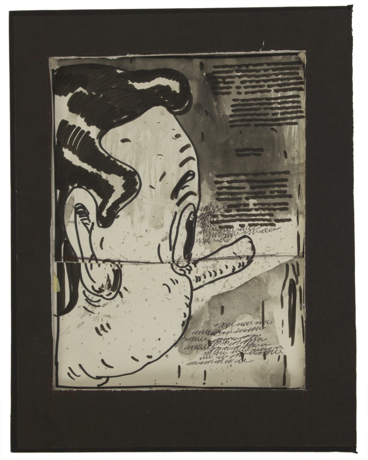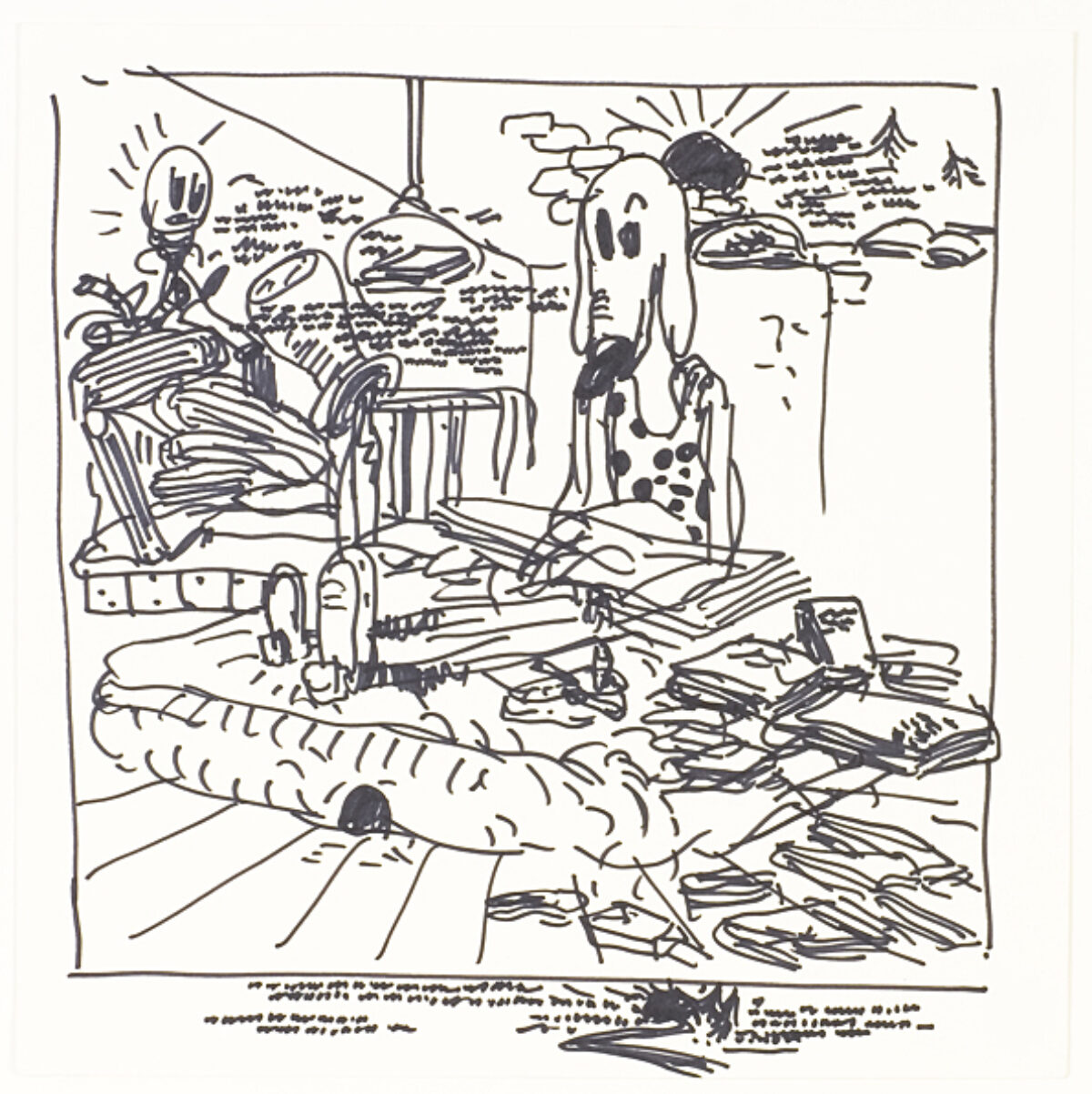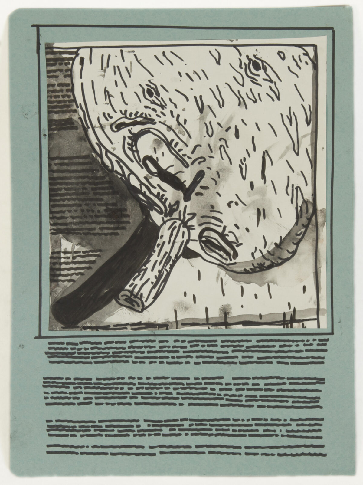 In such a way, the passionately emerging paintings move in their peculiar grotesqueness between the tragedy of the Spanish artist Francisco de Goya and the banality of American artist Philip Guston, who Eloyan is very close to, especially when it comes to the cumbersome technique of painting objects such as shoes. These paintings are tragic, partly tragicomic, and sometimes even sinister in the lucidness with which animals take on all the possible discord of the human world. They are banal in the honest naïveté with which Eloyan presents the figures in her painting from the vulgar, often disgusting and rampant fantasy of the exuberant world of comics, fairy tales, legends, rock n’ roll, TV shows, and mediocre movies. Eloyan’s world stands up against all romantic ideals, against all notions of beauty and harmony, of the superiority of humans over other creatures, of temperance, sophistication, and moderation. His world, teeming with savage pigs, eccentric ducks, stumps that behave like humans, is not temperate, cultivated or restrained – it is just plain human.