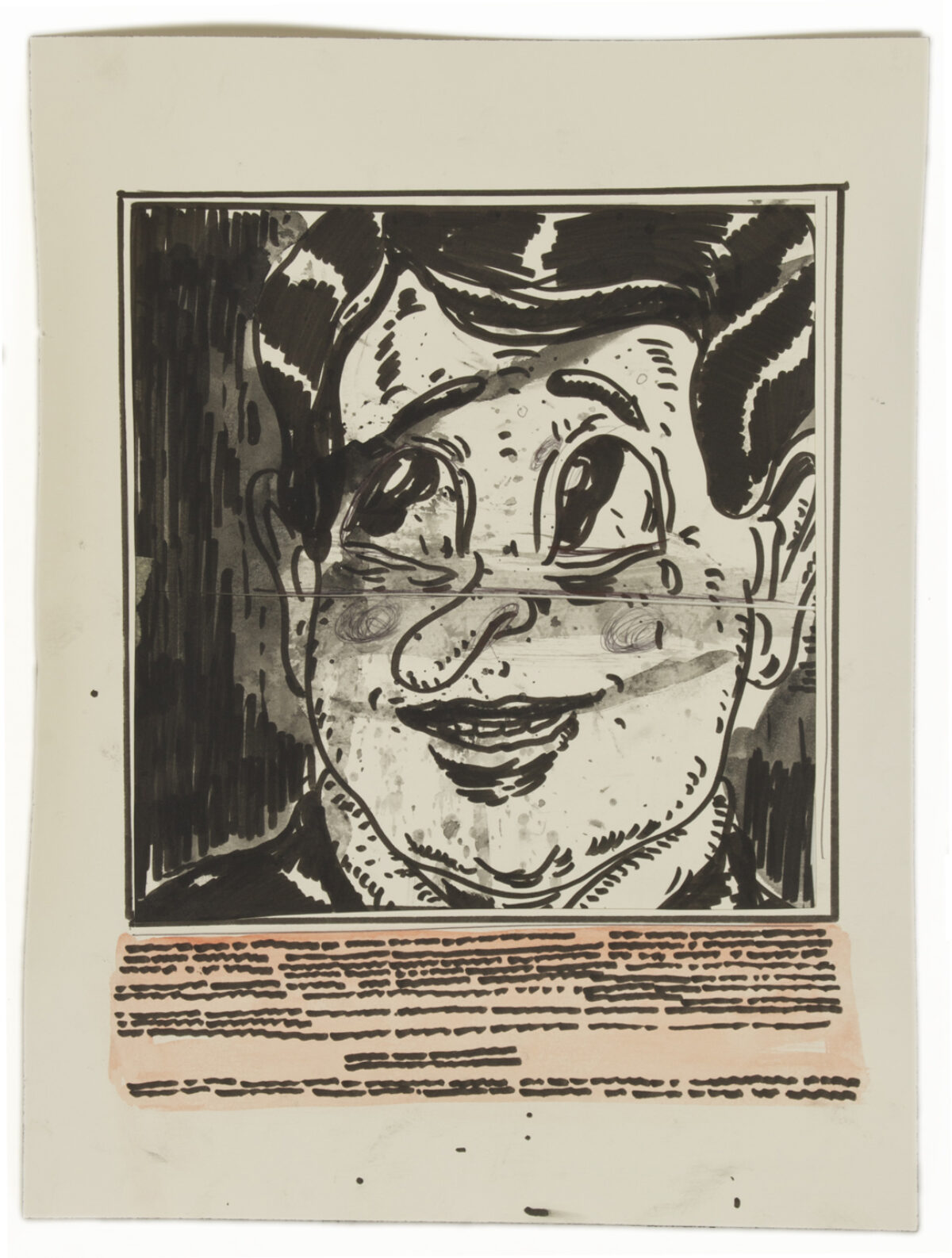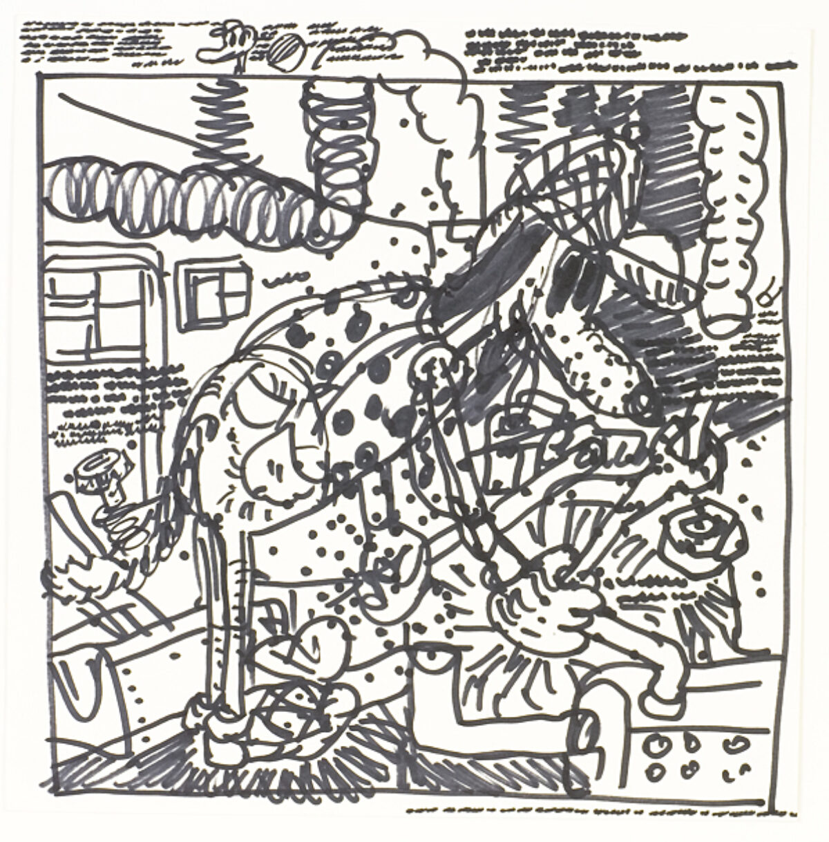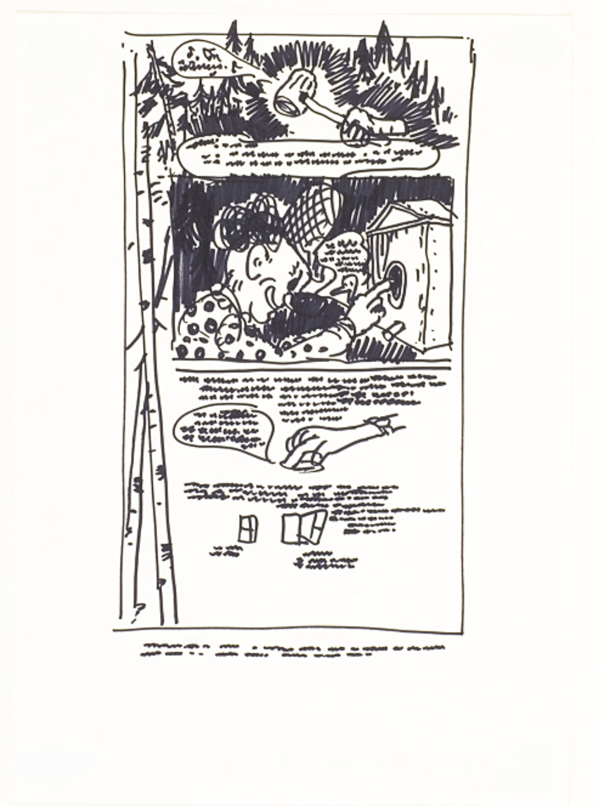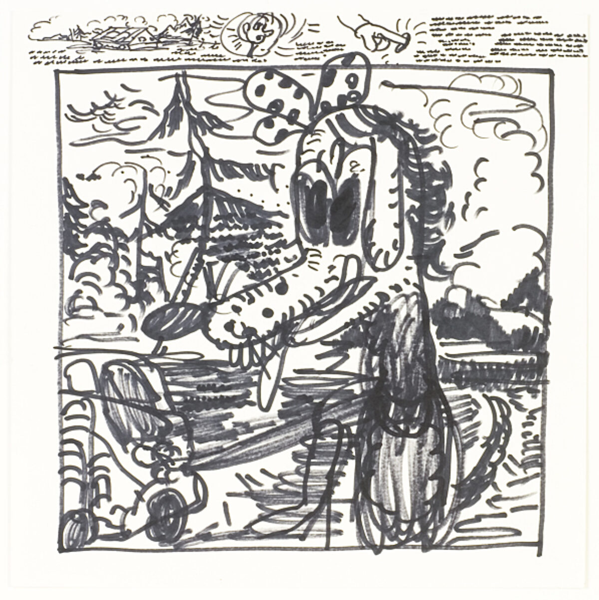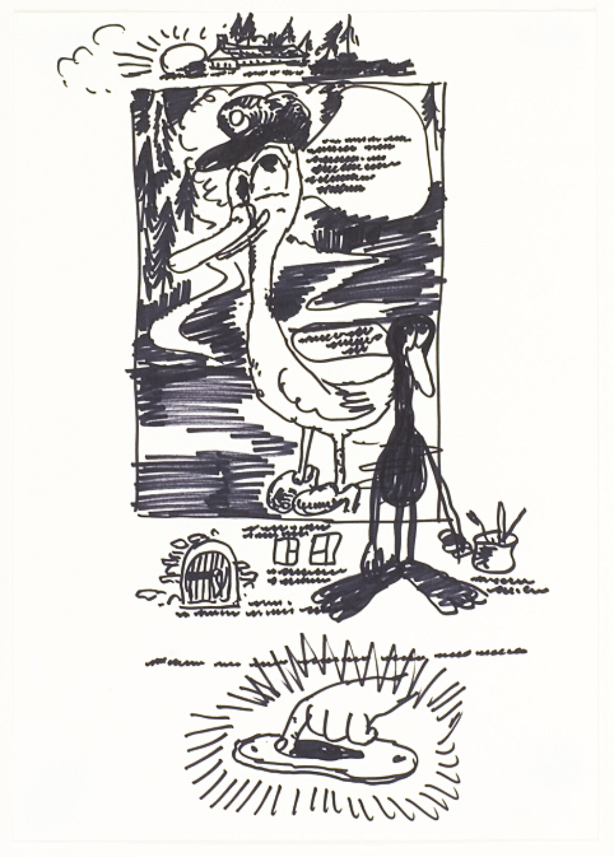 Since when is Donald Duck a hero with a place reserved in exhibition halls? The duck with rustled feathers sits on the ground with his legs absurdly raised in the air, with a Sherlock Holmes cap on his head and heavy boots, as if he were ready to set off on a tour of the Alps. And this is all presented in a space of 3 x 4 metres. Another example is a wooden stick with Pinocchio’s nose and feet in huge red shoes. The first is seen as a painter with the palette at his foot, and the second is like a leaping dancer. And what about the pink pig with a baseball cap, the dancing bean, a tea pot with a long nose. Where did this art come from?
