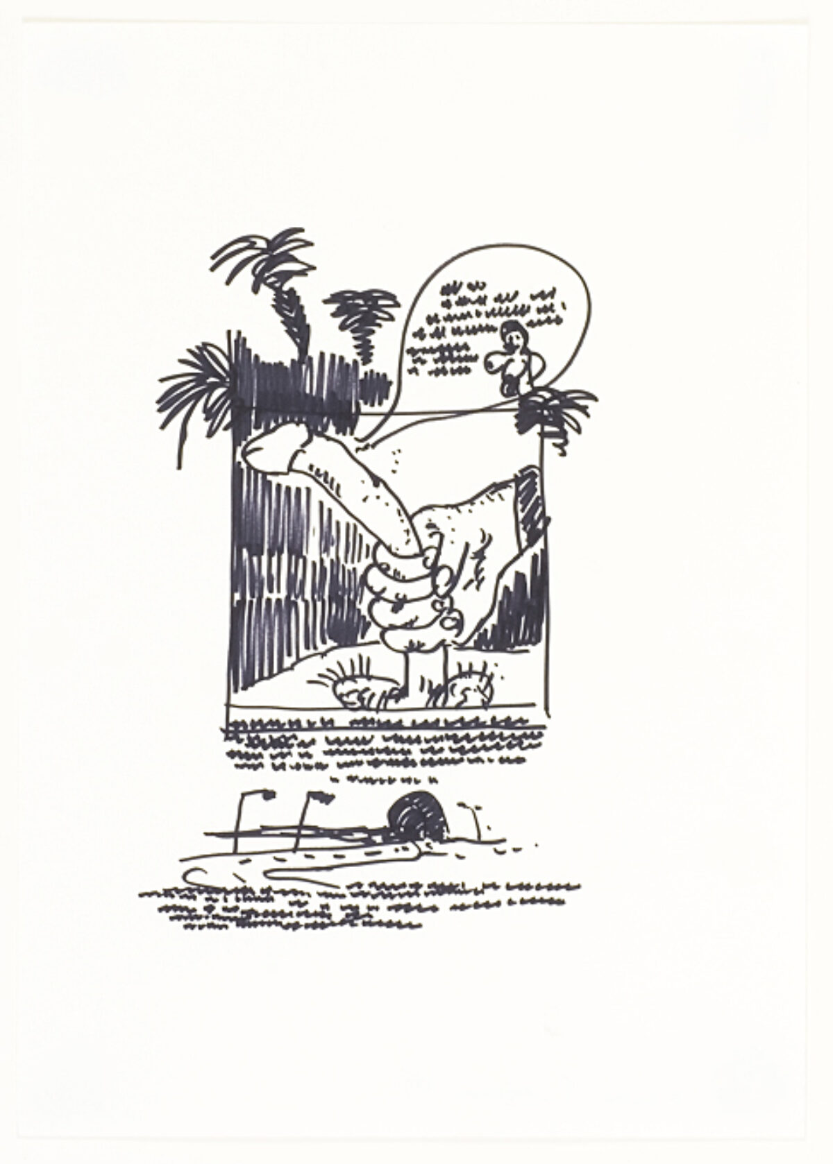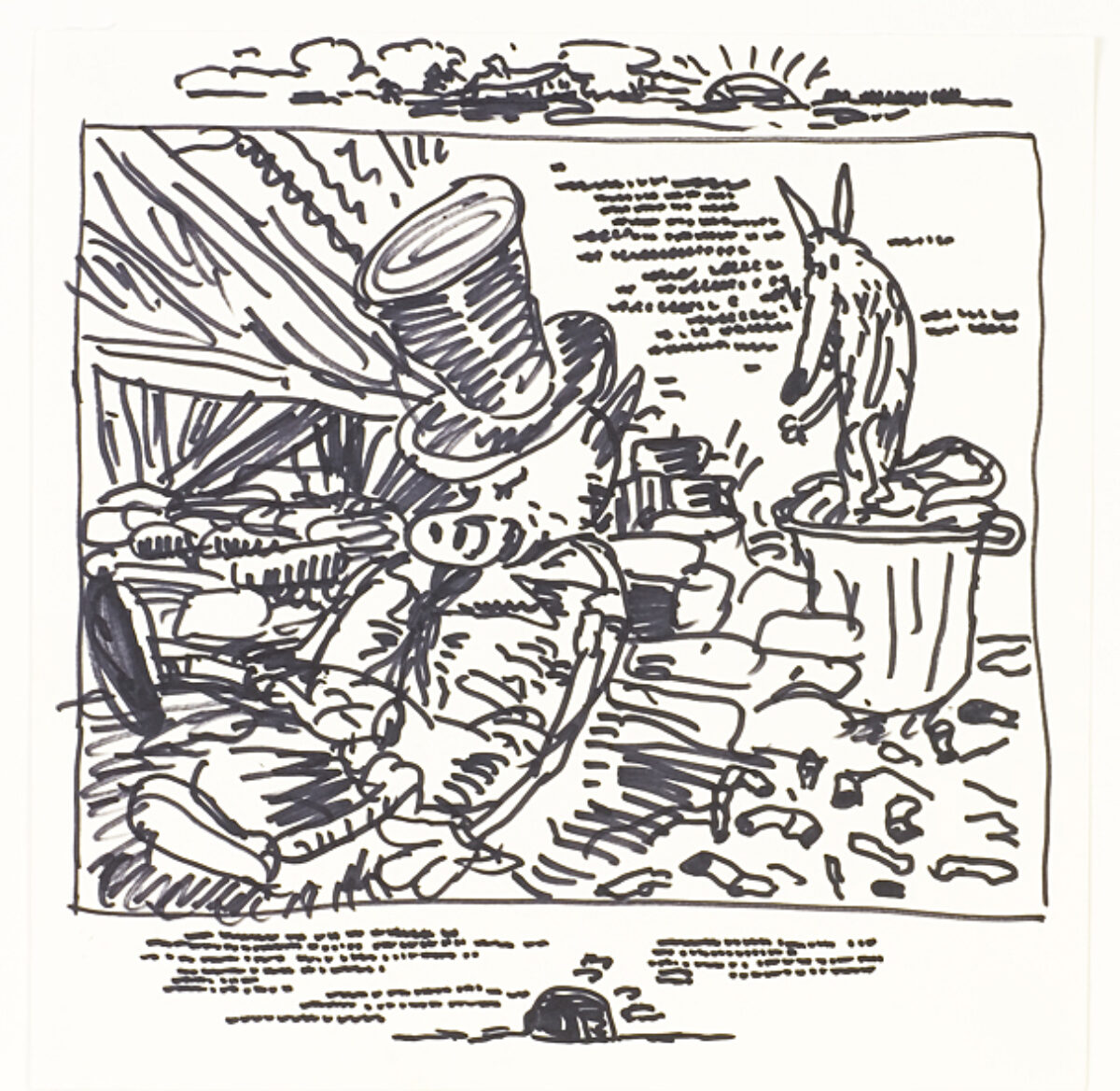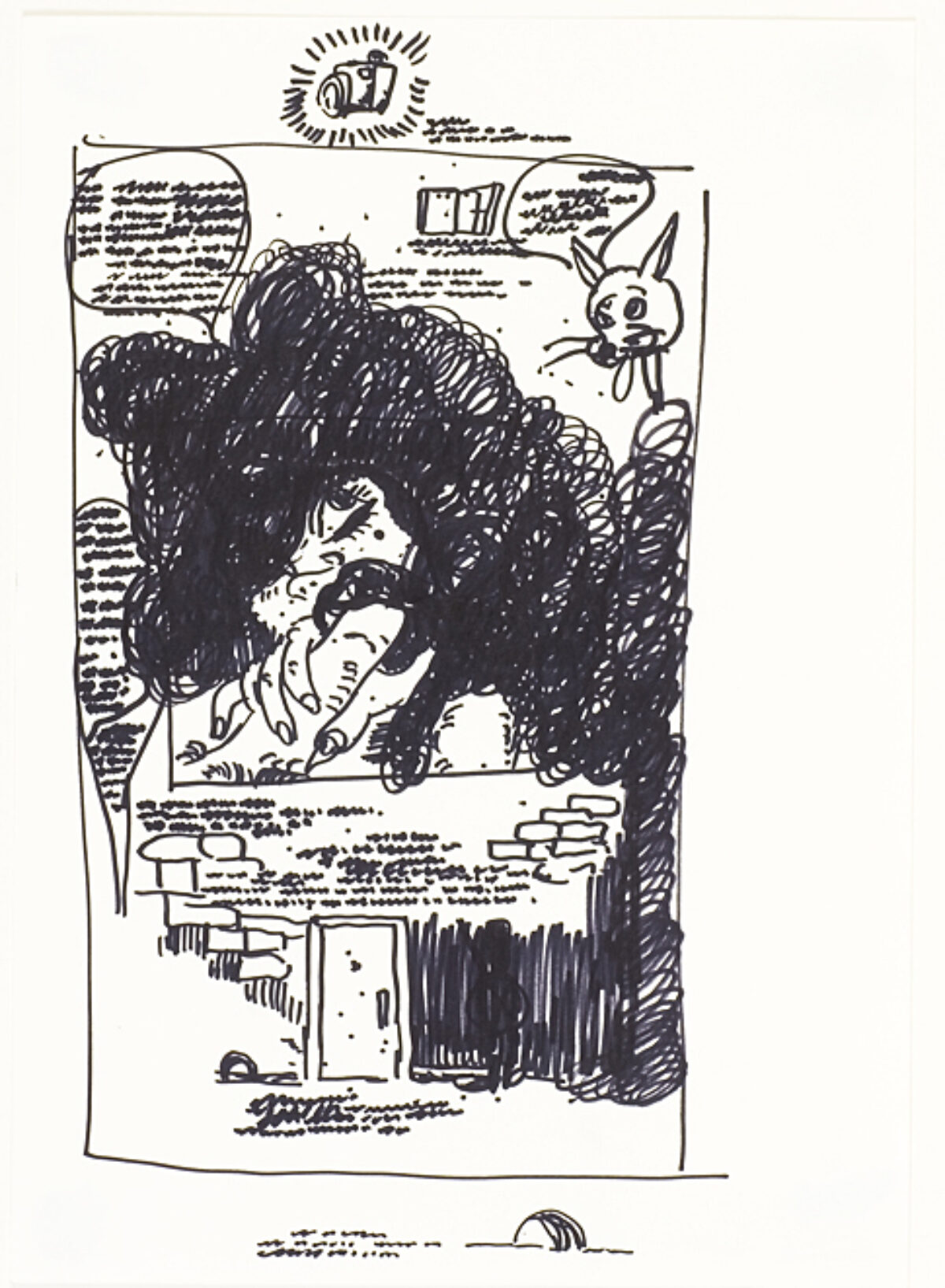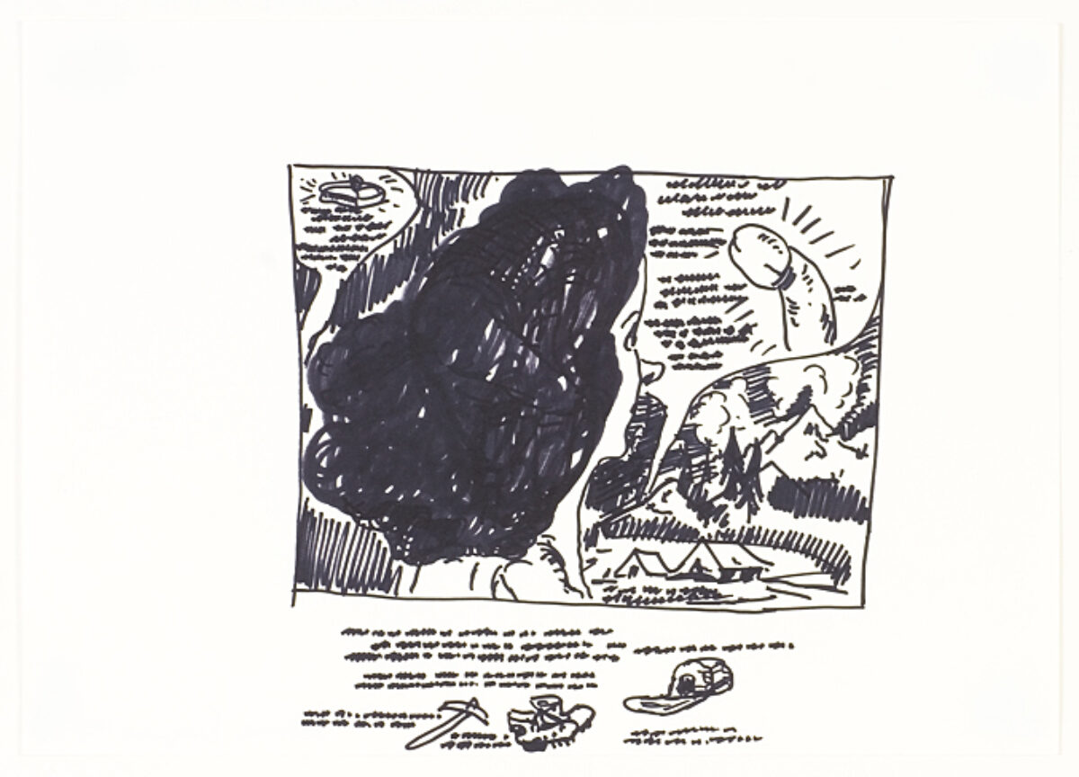 Since when is Donald Duck a hero with a place reserved in exhibition halls? The duck with rustled feathers sits on the ground with his legs absurdly raised in the air, with a Sherlock Holmes cap on his head and heavy boots, as if he were ready to set off on a tour of the Alps. And this is all presented in a space of 3 x 4 metres. Another example is a wooden stick with Pinocchio’s nose and feet in huge red shoes. The first is seen as a painter with the palette at his foot, and the second is like a leaping dancer. And what about the pink pig with a baseball cap, the dancing bean, a tea pot with a long nose. Where did this art come from?