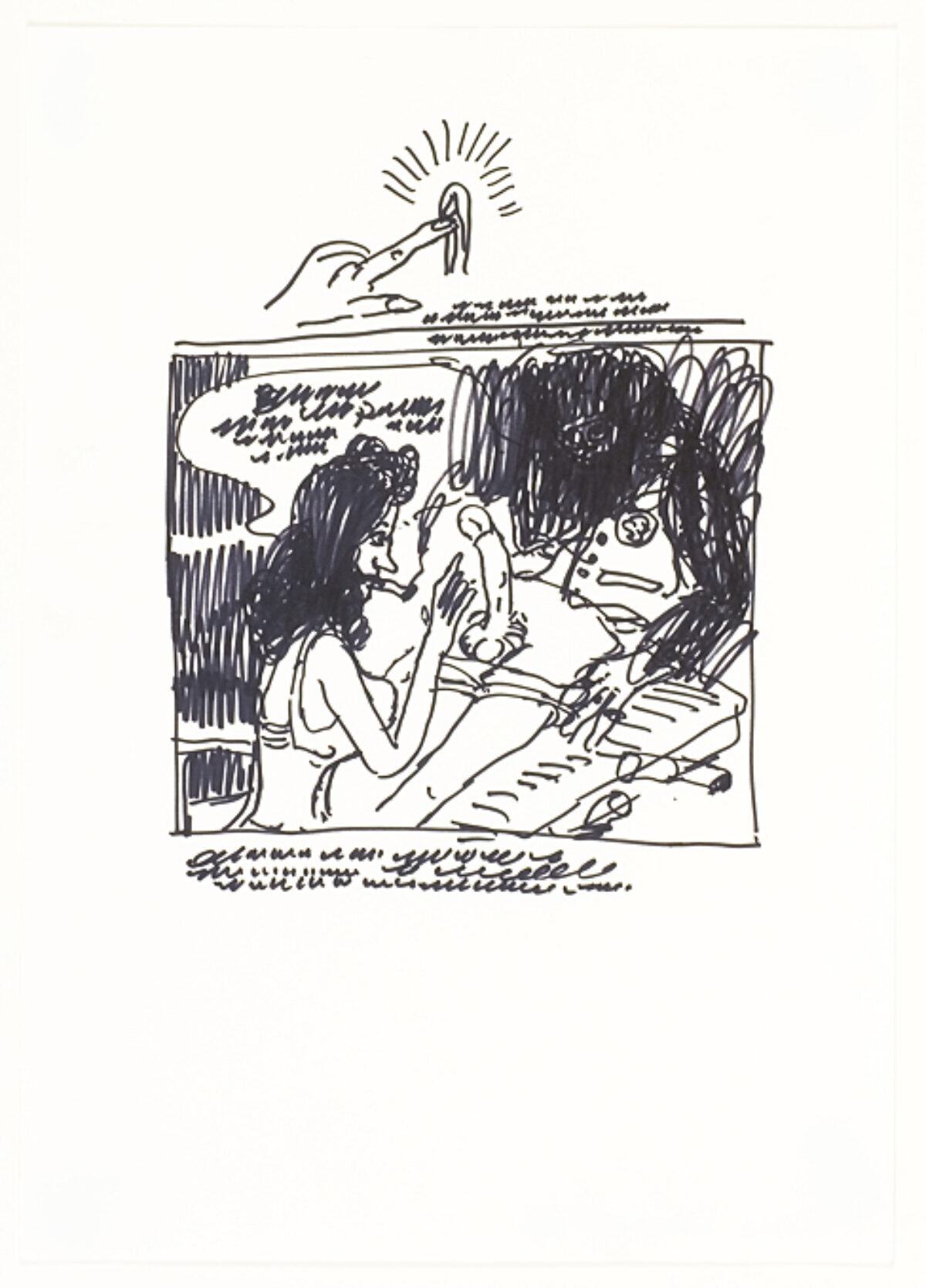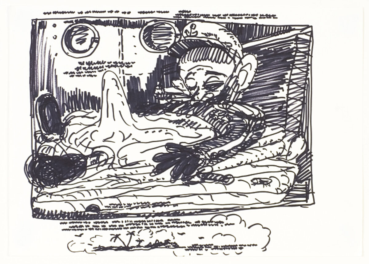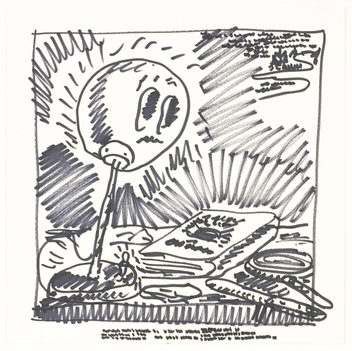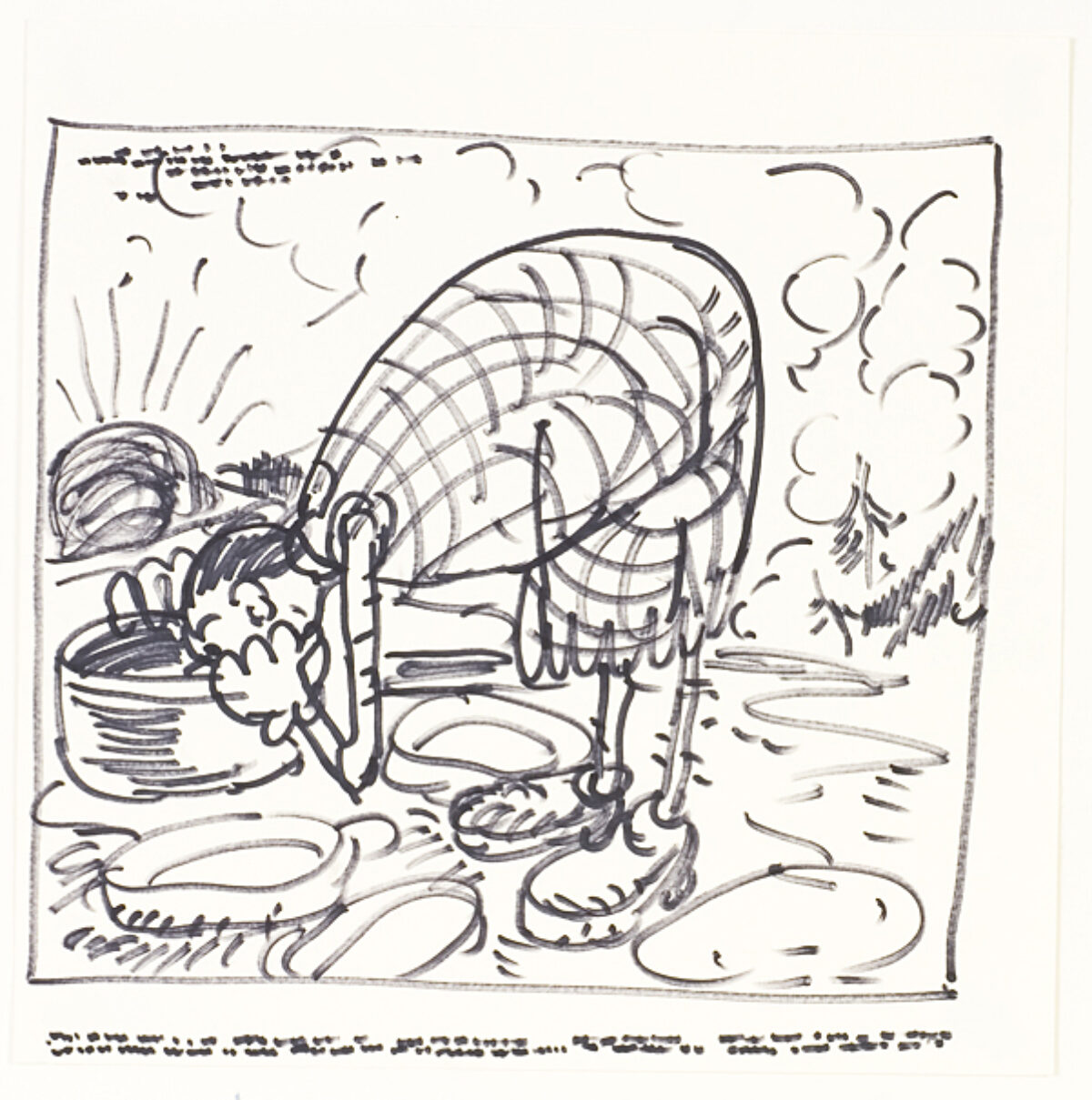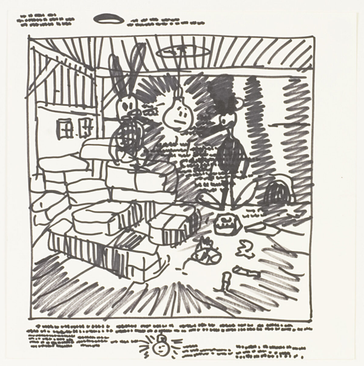 Since when is Donald Duck a hero with a place reserved in exhibition halls? The duck with rustled feathers sits on the ground with his legs absurdly raised in the air, with a Sherlock Holmes cap on his head and heavy boots, as if he were ready to set off on a tour of the Alps. And this is all presented in a space of 3 x 4 metres. Another example is a wooden stick with Pinocchio’s nose and feet in huge red shoes. The first is seen as a painter with the palette at his foot, and the second is like a leaping dancer. And what about the pink pig with a baseball cap, the dancing bean, a tea pot with a long nose. Where did this art come from?