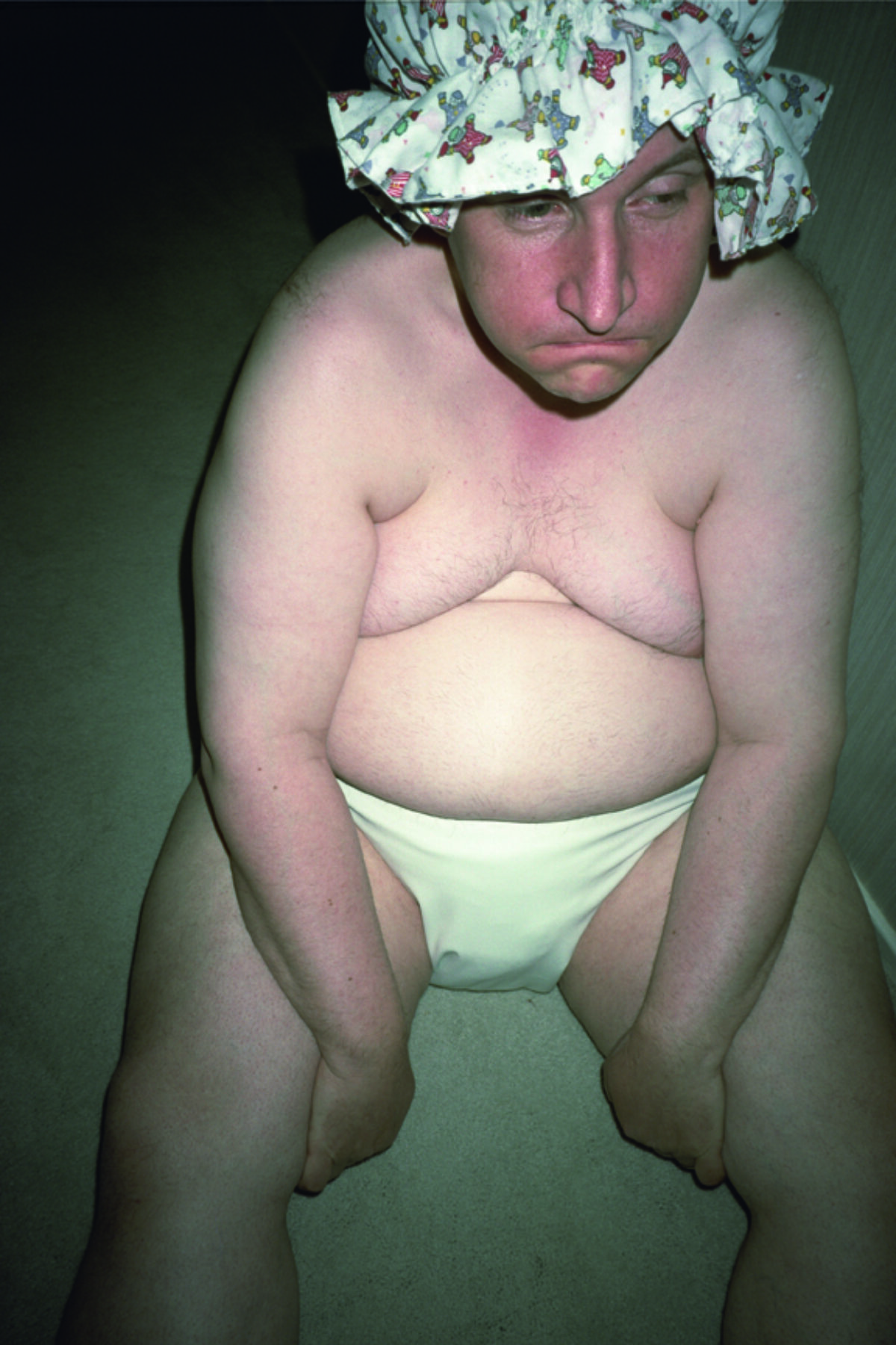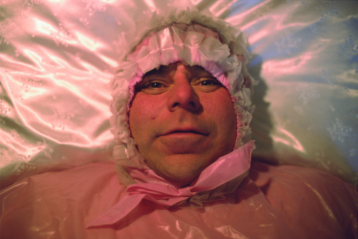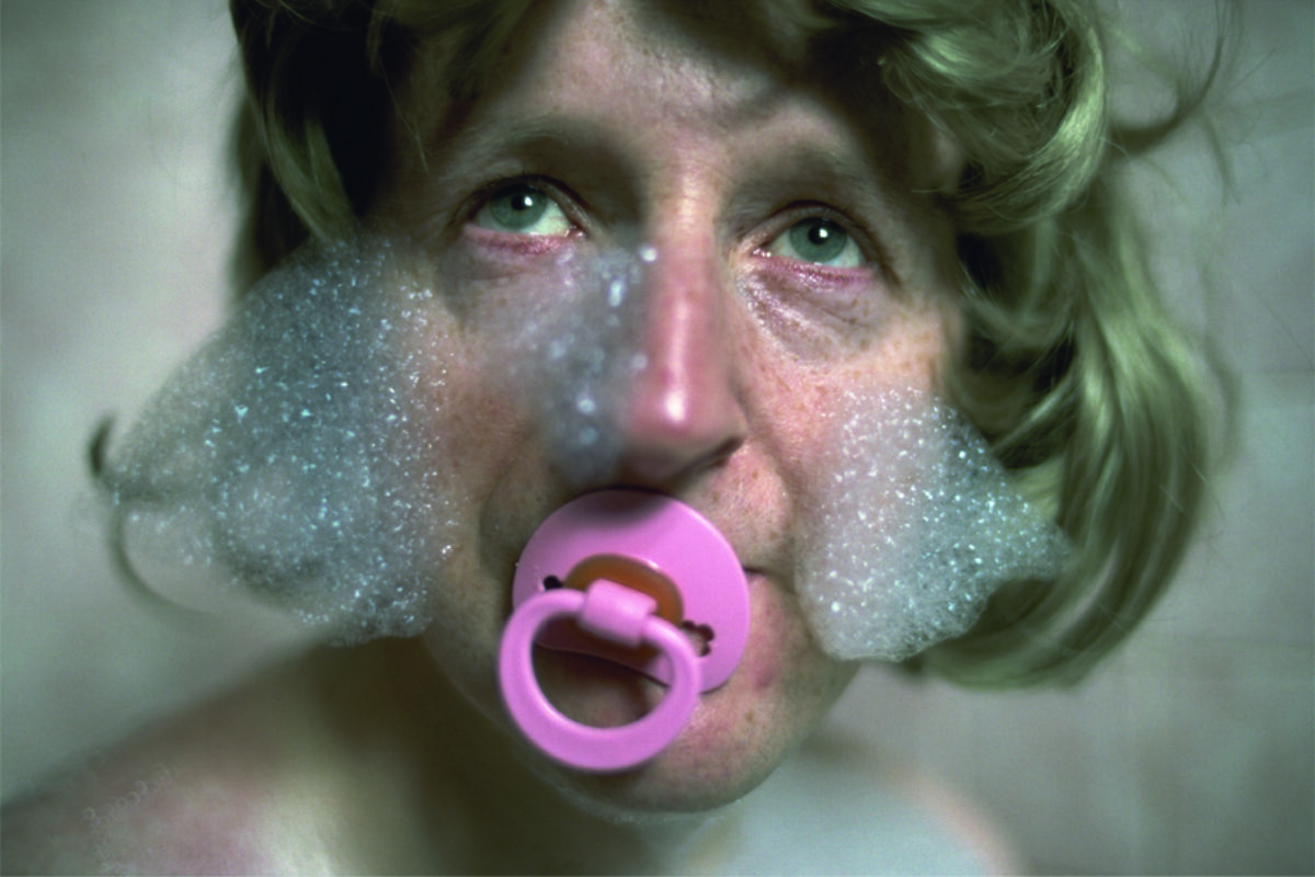 Despite all of this, Borland does not particularly enjoy photography as documentation. Her photos do not document but rather create their own world in which dreams and sexual fantasy are dominant. This is even present in the already mentioned portraits that are often flagrantly colourful or conceived in a very unusual way (Kylie Minogue as if she were rolled up in a chair). Her dreams, desires and wit are then developed in series that she sometimes publishes as book editions. “The Babies” from 2001 is a book series of photographs with text by the American theoretician Susan Sontag, which boggles the mind of a sober spectator. It shows fetishists who dress like babies. In fact, Borland managed to make contact with the club Hush-a-Bye Baby, which organizes this type of fetish, and to gain the confidence of its members. We watch the dancing “babies” in infant clothing with old, worn legs sticking out from underneath, or an elderly man with a pacifier immersed in bath bubbles (“Julianne in bath at home”).