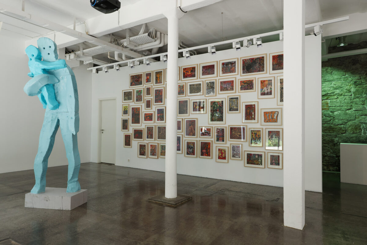 Im Mittelpunkt der Schau steht Carrons überlebensgroße Skulptur mit dem Titel Mann und Kind. Sie ist speziell für diese Präsentation konzipiert worden und korrespondiert hier auf Wunsch des Künstlers mit über fünfzig Collagen von Chessex (1934–2009) – als skulpturaler Ruhepol zu den eher existentialistischen Papierarbeiten.