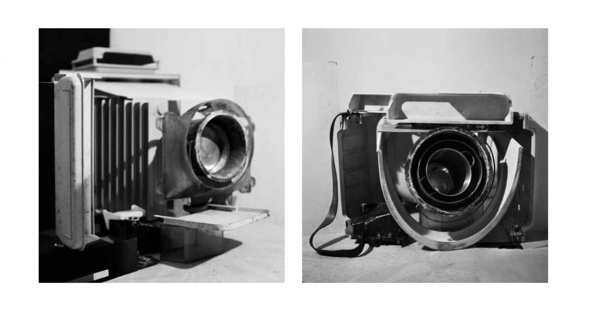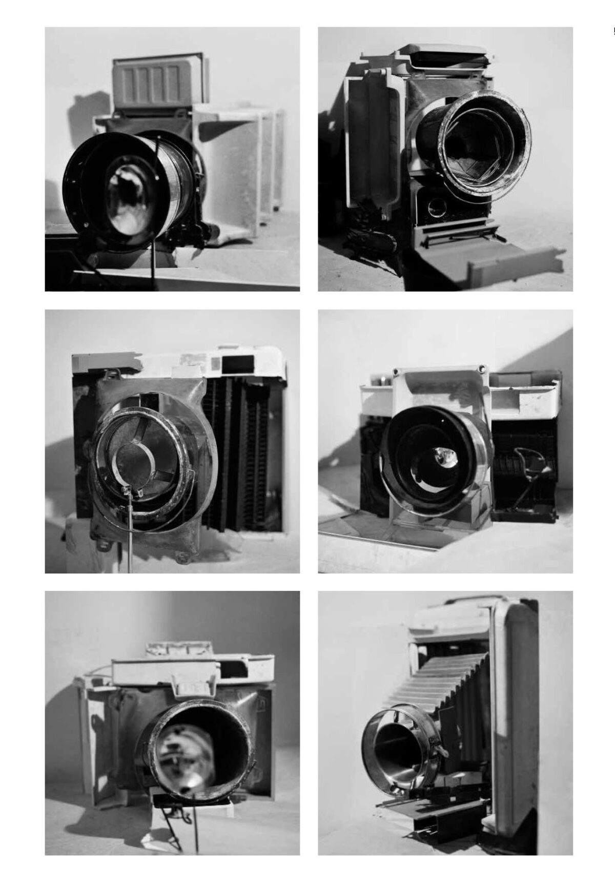 Gleichzeitig arbeitet Voita an der Serie „Caméras“. Er kombiniert eine Vielzahl von Objekten aus seinem Atelier, die er dann so fotografiert, dass sie wie Kameras aussehen. Auch hier ist es nur eine Illusion. Bei genauerem Hinsehen erscheinen die bereits bekannten Heizelemente, Rohre, Töpfe usw. vor den Augen des Betrachters. In Wahrheit ist es nur der Blick durch das Objektiv, der diesem Durcheinander von Objekten die Form einer Kamera verleiht. Und hier liegt die Ironie von Voitas Werk: Anstatt dass das Objektiv die Realität dokumentiert, täuscht es uns. Was sind diese Fotos anderes als eine Täuschung? Doch wie der oft zitierte Philosoph des 17. Jahrhunderts, Baruch Spinoza, wusste: Jede wirklich neue Idee ist zunächst eine bewusste Täuschung.