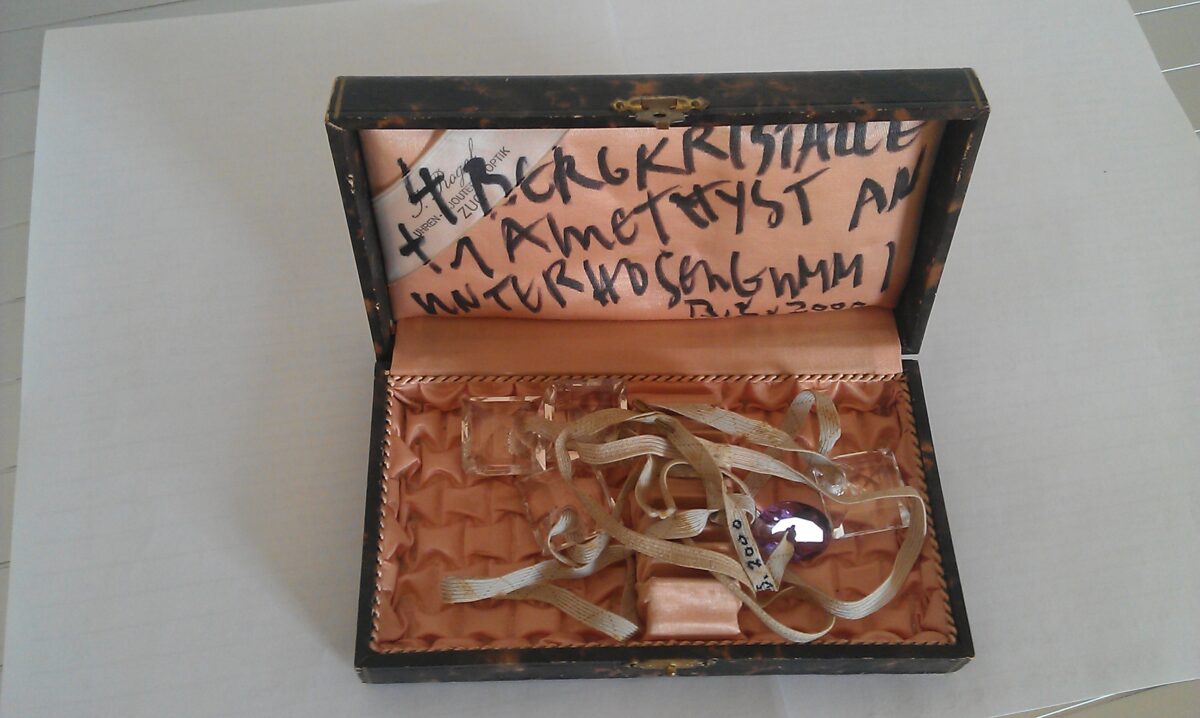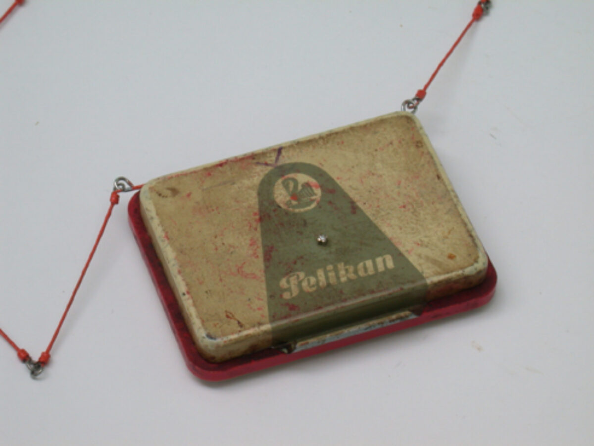 Als kleiner Junge sah Bernhard Schobinger die Figur eines Pelikans, der seinen Kindern Blut aus seinem eigenen Herzen auf einem Querbalken in der Wallfahrtskirche Hergiswald im Kanton Luzern fütterte. Für den späteren Schmuckkünstler wurde dieser Pelikan-Mythos die prägendste Erfahrung seiner Kindheit. Der Besuch dieser prachtvollen Kirche, so erzählt Schobinger, „war eine mystische Erfahrung für mich, die zu dem Wunsch führte, Goldschmied zu werden, um diesem Bereich nahe zu sein und mein Leben darin zu verbringen.“ Viele Jahre später – inzwischen ist Schobinger zu einem der weltweit renommiertesten Schmuckkünstler geworden, mit Ausstellungen unter anderem im MoMA in New York – erschuf er „Pelican Red Ink Pad“ (2003–2006). Von einer roten Halskette hängt ein Anhänger mit dem stilisierten Bild des Pelikans – einem Stempelkissen der deutschen Firma Pelikan. Auf dem blutroten Kissen liegen wie Eier zwei Tahiti-Perlen. Schobinger ist bekannt dafür, wertvolle Materialien, die typisch für Schmuck sind (wie Gold und Diamanten), mit scheinbar wertlosen Objekten wie abgenutztem Draht, alten Schrauben und Scherben zu kombinieren. Der kreative Akt des Findens und Zusammenfügens heterogener Materialien erreicht in Arbeiten, die sowohl Schmuckstücke als auch Kunstwerke sind, die eine fast alchemistische Elektrizität besitzen, seinen Höhepunkt. Der kreative Einsatz von Symbolen und die Einbeziehung eines Diamanten im Deckel des Stempelkissens – da „das bedingungslose Opfer des Vogels für seine Jungen [eine] enorme Ausstrahlung“ besitzt – verleihen dem Werk eine Tiefe, die in Schmuckstücken nicht häufig zu finden ist. Schobinger bedauert, dass im Laufe der Kulturgeschichte die ursprünglichen magischen und mythischen Aspekte des Schmucks allmählich verschwunden sind. Neben dem Prestige, das er bereits im Paläolithikum besaß, hat die westliche Gesellschaft dem Schmuck seine metaphysische Bedeutung genommen, sodass nur noch sein absurder und gegenseitig vereinbarter monetärer Wert übrig bleibt. In seinen Arbeiten nimmt Schobinger klar Stellung gegen diese Reduktion auf den ökonomischen Wert und die verringerten symbolischen Bedeutungen des Schmucks. Die teuren Perlen liegen im Stempelkissen verborgen, das um den Hals getragen wird, mit geschlossenem Deckel. Diese „Eier“ (ein Symbol für den Kreislauf von Leben und Tod) sind ebenso sicher und geborgen wie die Kinder in der Obhut des Pelikans. Die Art und Weise, wie das Material verwendet wird, bestimmt die Absicht und das Bild. In den Worten des Künstlers sind wir „verführt, die Tatsache, dass ‚alles mit allem verbunden ist‘, als universelle Wahrheit zu sehen.“