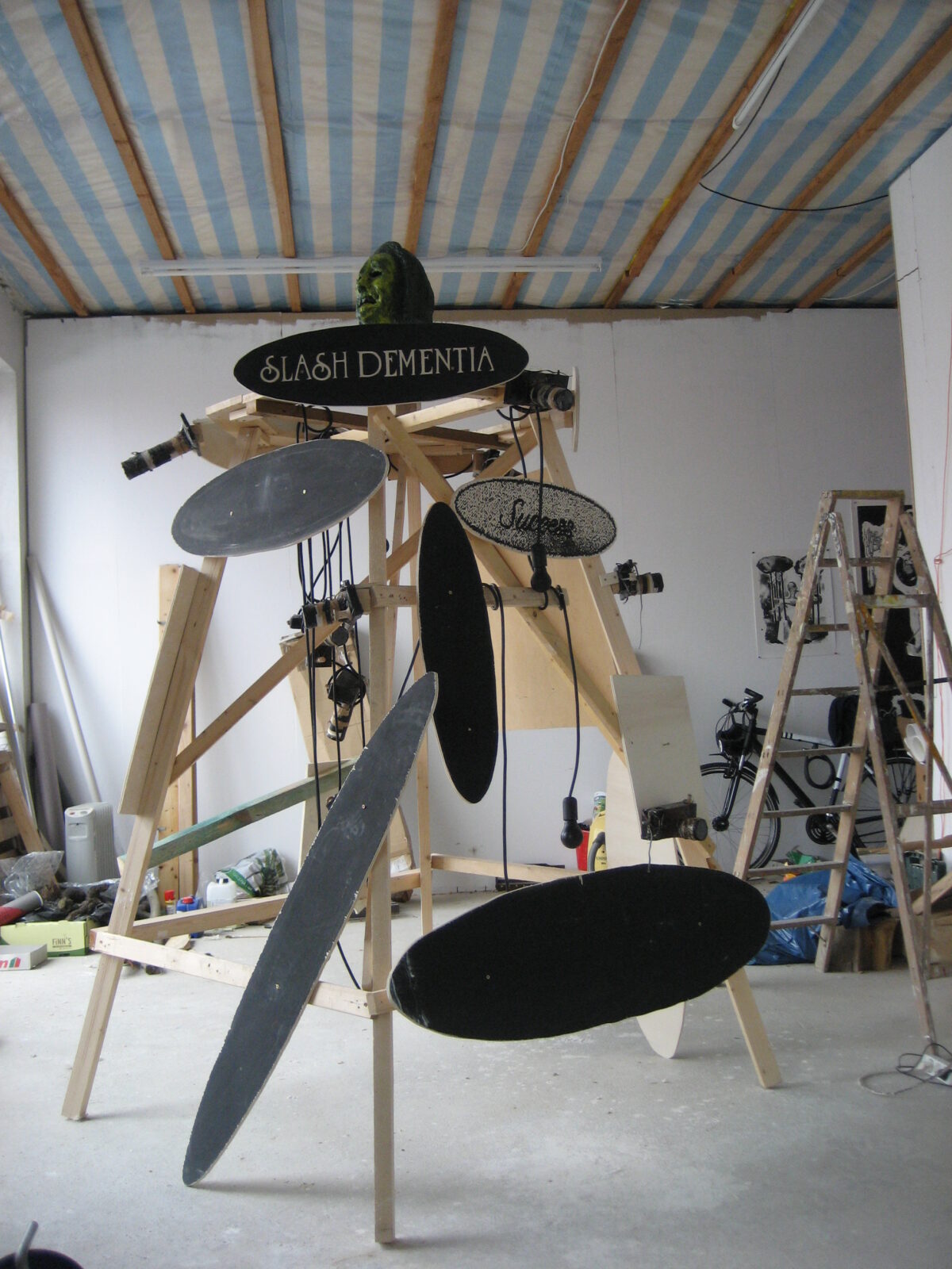„Der Zweck der Malerei ist es, die Welt zu offenbaren. Wir leben in einer Welt voller Gewalt und Lügen… Die Dinge, die wir jeden Tag hören, sind voller Zynismus. Die Gemälde zeigen, wie die Welt ist. Sie sind ein Porträt des Zeitgeists.“ Diese Aussage von Damien Deroubaix verheißt nichts Gutes. Und tatsächlich sind seine Werke erschreckend. Sie zeigen erschreckende Szenen voller aggressiver Symbolik. Wir kennen die skelettierte Figur des Todes und die Rachen von Haien aus der Kunstgeschichte ebenso wie aus der Comic-Ästhetik der Heavy-Metal- und Goth-Szenen, die bekannt sind für ihre Faszination für die dunkle Seite des Lebens. Aber wir sind auch mit solchen Bildern der Angst aus den dunklen Kapiteln der Geschichte vertraut, und nicht zuletzt aus dem Alltag. Hier begegnen wir Hakenkreuzen und Wachtürmen; dort verschmelzen die Sterne und Streifen mit einem Barcode. Wie schon Hieronymus Bosch zuvor, zeigt Deroubaix, dass das Böse nicht der Spross einer verdorbenen Phantasie ist, sondern dass es sehr real ist. Schließlich ist es eine Realität der heutigen Zeit, dass Krieg und Kapitalismus in all ihrer Brutalität eng miteinander verbunden sind und dass diese Entwicklung nur schlecht enden kann. Die erschreckenden Gespenster lassen ein letztes erschrockenes „Ja“ hören, der Mund voll Banknoten. Die Welt geht unter, zynisch. Aber trotzdem, so Deroubaix, ist es wichtig, dass es Spaß macht, daran zu arbeiten – er findet nicht, dass seine Werke hoffnungslos sind. Sein Sinn für Humor zeigt sich in seiner Erklärung, warum er mit Aquarellen und Holzschnitten arbeitet. Aquarelle werden mit Sonntagsmalern assoziiert, und Horror und Aquarelle sind ein interessanter Gegensatz. Und durch die Arbeit mit Holzschnitten kann er seine französischen Landsleute provozieren, weil in ihren Köpfen es die Technik der deutschen Expressionisten ist. Tatsächlich wird Deroubaix oft als mehr deutscher Maler bezeichnet, beeinflusst unter anderem von Otto Dix und Martin Kippenberger. Deroubaix‘ Werk beschränkt sich nicht nur auf Gemälde, Zeichnungen und Holzschnitte, sondern umfasst auch Collagen, Skulpturen und Installationen. Seine Holz-Türme sind als Übertreibung des klassischen Sockels gedacht und erinnern an Ölplattformen oder Wachtürme – Vertreter von Macht und Stärke. An ihnen sind Sprechblasen mit aggressiven politischen Slogans, Überwachungskameras und Mikrofone befestigt. Als Hommage an den tschechischen Fotografen hat Deroubaix auch einen „Tichý-Turm“ mit selbstgebauten Kameras, Bildern von Frauen und Schwarzlichtröhren als Darstellungen der Dunkelheit nach dem Zeitalter der Aufklärung („Siècle des Lumières“, wörtlich übersetzt: „Jahrhundert des Lichts“) geschaffen.