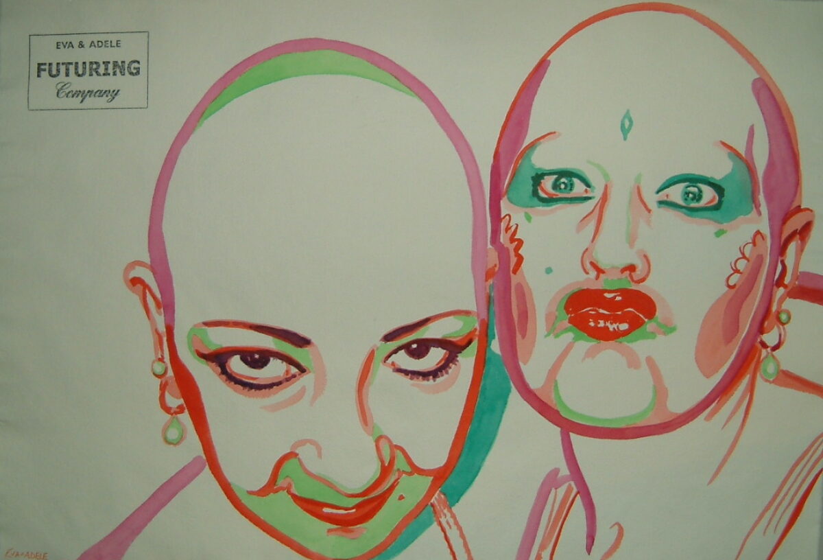 Man findet sie bei jedem wichtigen kulturellen Ereignis: Eva und Adele. Immer zusammen, immer gleich gekleidet, kahlköpfig, mit markantem Make-up und meist im Gespräch mit irgendeiner wichtigen Persönlichkeit der Kulturszene – freundlich und interessiert. Diese selbsternannten „hermaphroditischen Zwillinge aus der Zukunft“ sind auch in einer Reihe von Selbstporträts zu sehen, die den Titel Futuring Company tragen – natürlich zusammen und in den gleichen schrillen Farben wie ihr Make-up. Kunst und Leben könnten nicht mehr miteinander verwoben sein. Wenn sie in die Stadt gehen, dann immer als Eva & Adele – damit die Leute sie erkennen, damit sie Kunst sind und Kunst machen. „Die Arbeit von Eva & Adele basiert auf dem Bild, das wir nach außen hin mit einem Gefühl der Zugehörigkeit und einem übertriebenen Erscheinungsbild präsentieren“, sagen die Künstler, die im Allgemeinen als eine Einheit sprechen. Wo immer Eva und Adele erscheinen, zücken die Menschen ihre Kameras und machen noch mehr Fotografien. In ihren Serien Cum und Mediaplastic verwandeln sie diese Amateur- und Profifotografien in Dias oder Gemälde, die sie dann in ihr künstlerisches Werk integrieren. Im Gegensatz zum Künstlerpaar Gilbert & George, die sich selbst als „lebende Skulpturen“ beschreiben, erscheinen Eva und Adele ausschließlich als ihre Alter Egos und sprechen niemals über ihre wahre Identität (außer über ihre physischen Maße, wie es bei Kunstwerken üblich ist); sie sind ausschließlich künstlerische Wesen. Da sie aus der Zukunft kommen, behaupten sie, keine Vergangenheit zu haben. Sie beanspruchen kein Geschlecht. Sie existieren nur zusammen. Sie lieben einander. Ihre Prinzipien hinterfragen nicht nur künstlerische Konzepte wie Kunstwerk, Autorschaft oder künstlerische Biografie, sondern auch politische und soziologische Definitionen. Seit ihrer Hochzeit im Jahr 1991 leben und schaffen Eva und Adele gemeinsam Kunst. Ihr Video Bell Brides (2004) beschäftigt sich mit dem, was sie selbst versprochen haben: eine lebenslange Bindung. In Brautkleidern gekleidet, stehen sie mehr als eine Stunde nebeneinander und blicken in die Kamera. Dabei kommen sie wirklich ins Schwitzen.
