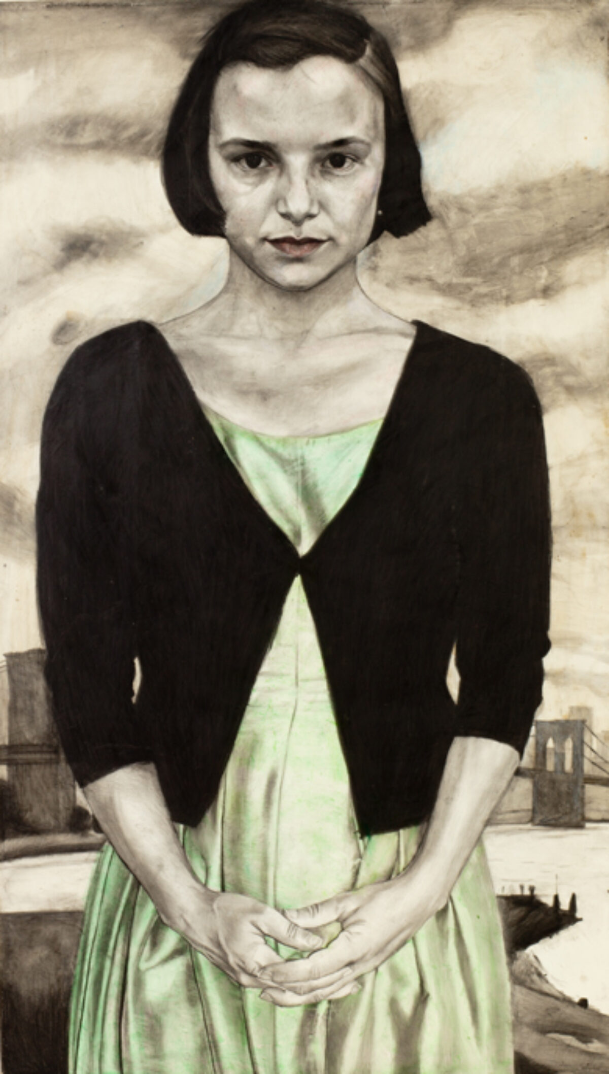 Jenny Scobels Porträts sind bemerkenswert, da sie keiner bestimmten Zeitperiode zugeordnet werden können. Die dargestellten Personen stammen größtenteils aus unserer Epoche, doch ihre Kleidung und sogar ihre Gesichtsausdrücke und Körperhaltungen gehören der Vergangenheit an. Scobel kleidet ihre Figuren bewusst in Kleidung aus den 1930er- und 1940er-Jahren oder in historische Gewänder, und manchmal tragen die Frauen Kopfbedeckungen, wie wir sie von Porträts des deutschen Malers Hans Holbein aus dem 15. Jahrhundert kennen. Das auffälligste Merkmal der dargestellten Personen ist jedoch, wie abgemagert und erschöpft sie erscheinen. Sie haben einen strengen, fast calvinistisch asketischen Blick. So stellte der amerikanische Maler Grant Wood seine Zeitgenossen während der Großen Depression in den 1930er-Jahren dar. Sein berühmtes „American Gothic“ (1930) zeigt ein sorgenvoll aussehendes, abgemagertes, vorzeitig gealtertes und ernst dreinblickendes Bauernpaar mit einer Heugabel. Scobel hat diese Darstellungsweise übernommen, in der die Figuren aus dem Bild zu treten scheinen und ihre Welt (im „American Gothic“ der Bauernhof im Hintergrund) hinter sich lassen.