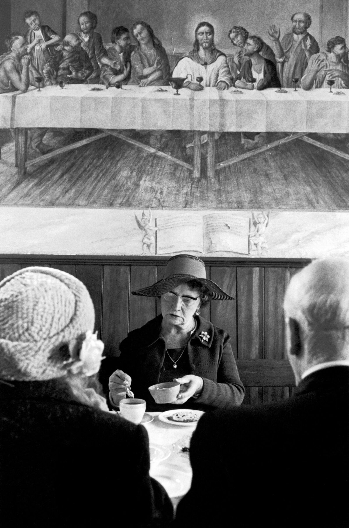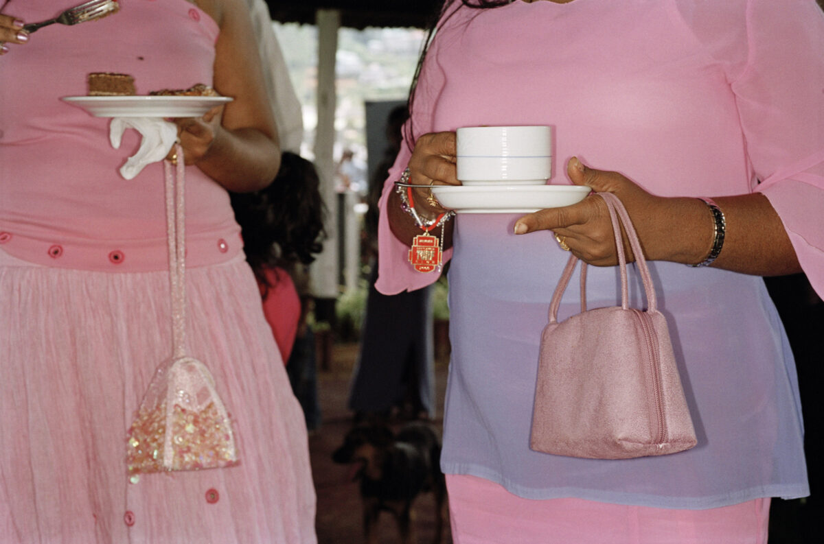 Die Welt der neuen Reichen ist bunt, und Parrs Fotografien dieser Welt sind noch bunter. Sein Foto, das 2004 in Ascot aufgenommen wurde und zwei Frauen zeigt, die [nebeneinander?] stehen, ist einzigartig. Auf der linken Seite steht eine korpulente Frau in einem pinken Kleid, und rechts eine junge Frau in einem säurevioletten Kleid. Zwischen den beiden Frauen befindet sich eine Tasche, die mit künstlichen Blumen verziert ist. Plötzlich bemerken wir einen kleinen Fleck auf dem aufgeblähten Bauch der korpulenten Frau. Dieser Fleck ist genau das, was ein kleines Stück Menschlichkeit unter den affektierten Reichtümern und gesellschaftlichen Attributen offenbart, während er gleichzeitig Parrs einzigartigen Sinn für Humor anzeigt. Er nutzt Humor nicht, um sich über seine Motive lustig zu machen, sondern im Gegenteil, um ihnen ihre Menschlichkeit zurückzugeben, indem er ihre Momente der Schwäche und Ungeschicklichkeit [Unvollkommenheit, Albernheit vielleicht?] einfängt.