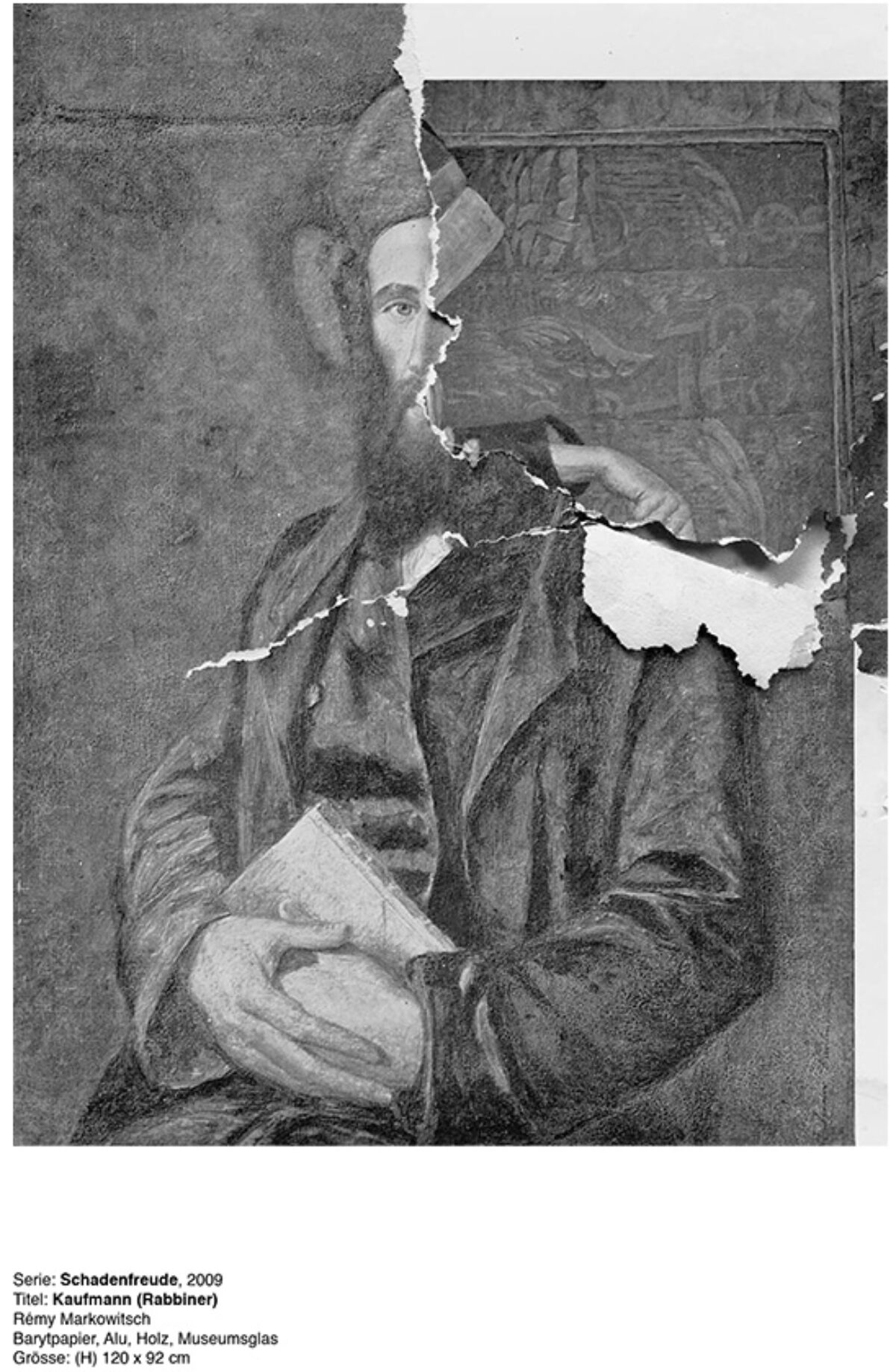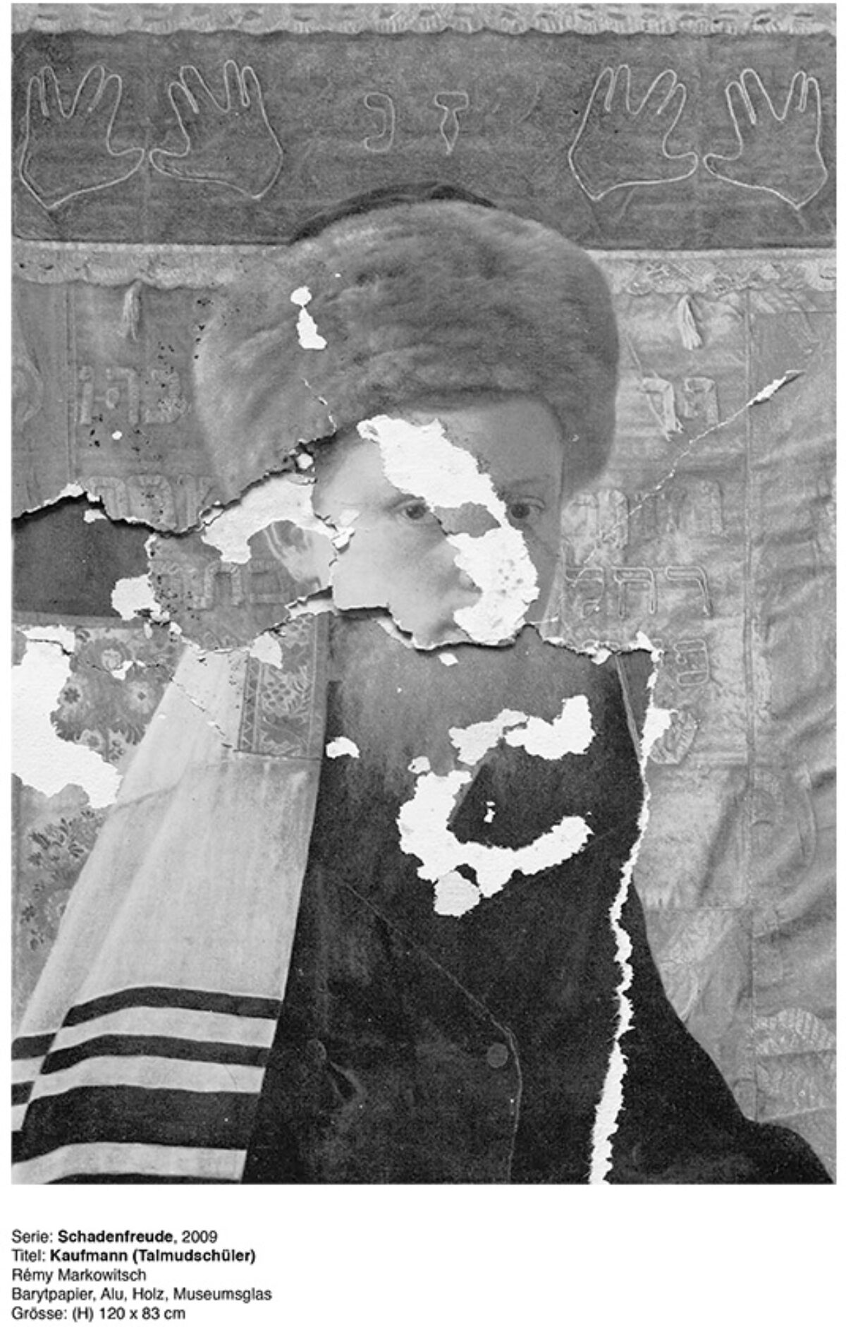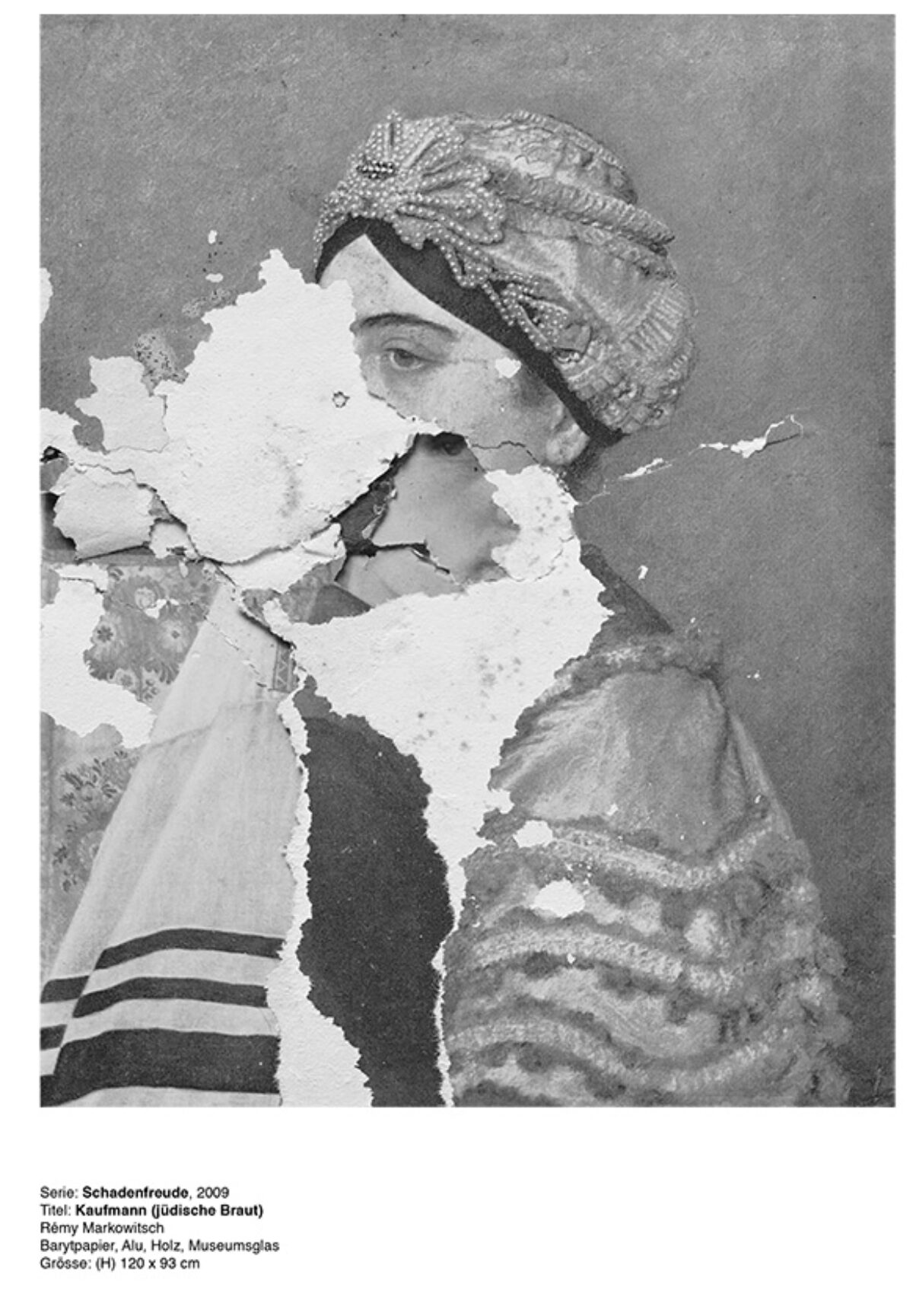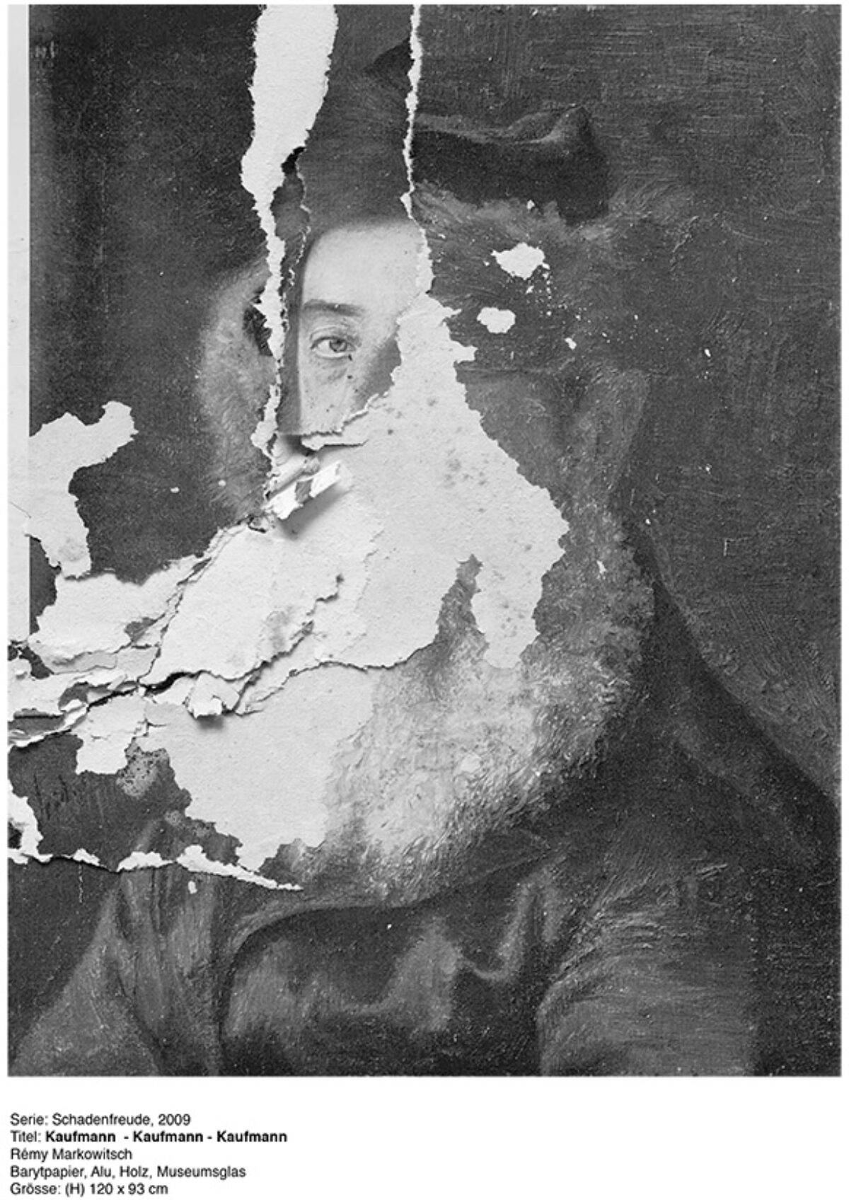 Alle Collagen enthalten ein Moment von Zerstörung und Wiederaufbau. Fragmente aus unterschiedlichen Quellen fügen sich zu einem neuen Bild zusammen. In Rémy Markowitschs Kaufmann (Talmudgelehrter) ist der Aspekt der Zerstörung deutlich sichtbar. Die visuelle Oberfläche des Bildes wird durch unregelmäßige Rissspuren und zerfetztes Papier geprägt, während die materielle Oberfläche homogen erscheint. Das gesamte Werk ist von einem fotografischen Firnis überzogen – wie eine Wasserschicht über einem felsigen Grund. Die Fotografie ist eines von zwölf Bildern aus der Porträtserie Schadenfreude, deren Grundlage ein Auktionskatalog aus dem Jahr 1962 bildet. Doch die darin abgebildeten Kunstwerke wurden nicht durch künstlerische Eingriffe miteinander kombiniert. Vielmehr entsteht ihre Durchdringung durch eine ungewollte Zerstörung: Schimmel hat sich durch das Buch gefressen und dabei verschiedene Bildteile aus unterschiedlichen Seiten übereinander sichtbar gemacht.