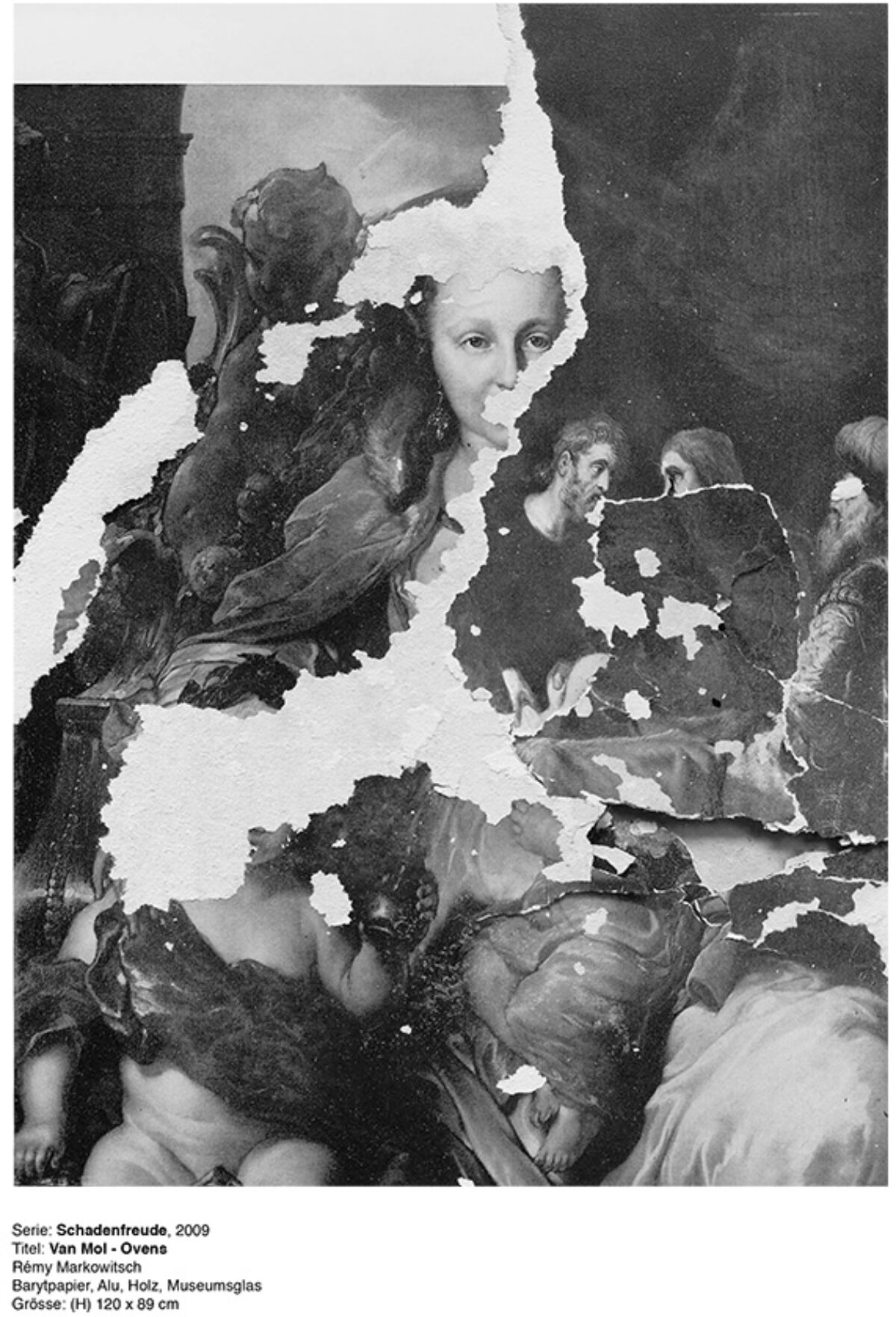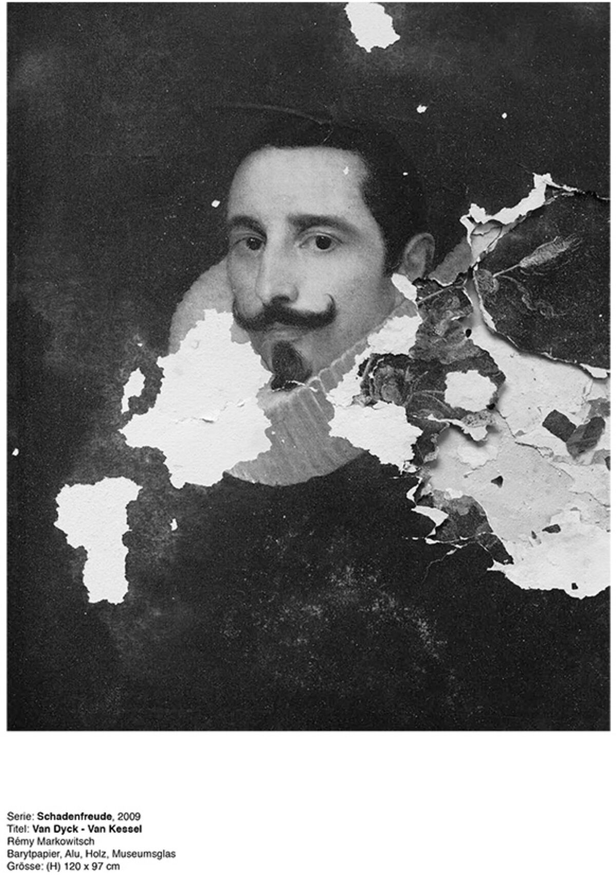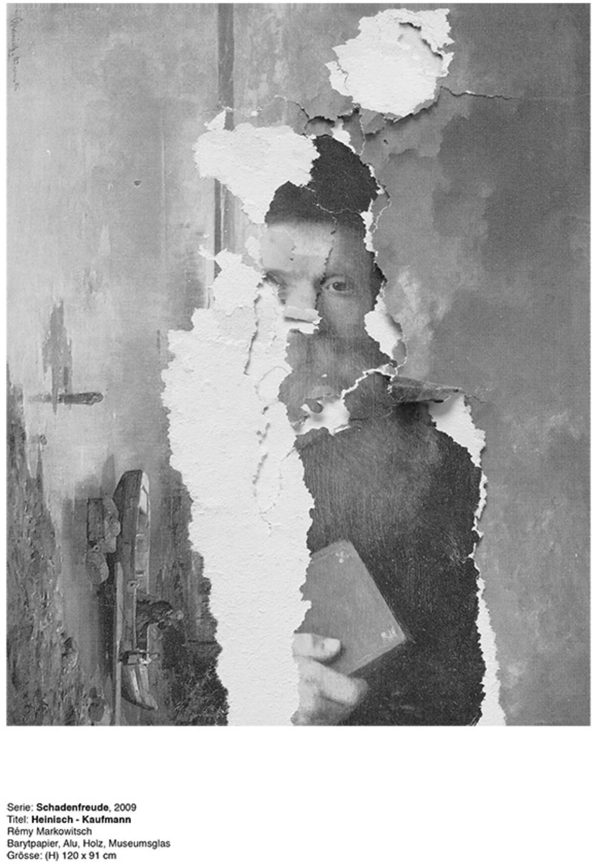 Alle Collagen enthalten ein Moment von Zerstörung und Wiederaufbau. Fragmente aus unterschiedlichen Quellen fügen sich zu einem neuen Bild zusammen. In Rémy Markowitschs Kaufmann (Talmudgelehrter) ist der Aspekt der Zerstörung deutlich sichtbar. Die visuelle Oberfläche des Bildes wird durch unregelmäßige Rissspuren und zerfetztes Papier geprägt, während die materielle Oberfläche homogen erscheint. Das gesamte Werk ist von einem fotografischen Firnis überzogen – wie eine Wasserschicht über einem felsigen Grund. Die Fotografie ist eines von zwölf Bildern aus der Porträtserie Schadenfreude, deren Grundlage ein Auktionskatalog aus dem Jahr 1962 bildet. Doch die darin abgebildeten Kunstwerke wurden nicht durch künstlerische Eingriffe miteinander kombiniert. Vielmehr entsteht ihre Durchdringung durch eine ungewollte Zerstörung: Schimmel hat sich durch das Buch gefressen und dabei verschiedene Bildteile aus unterschiedlichen Seiten übereinander sichtbar gemacht.