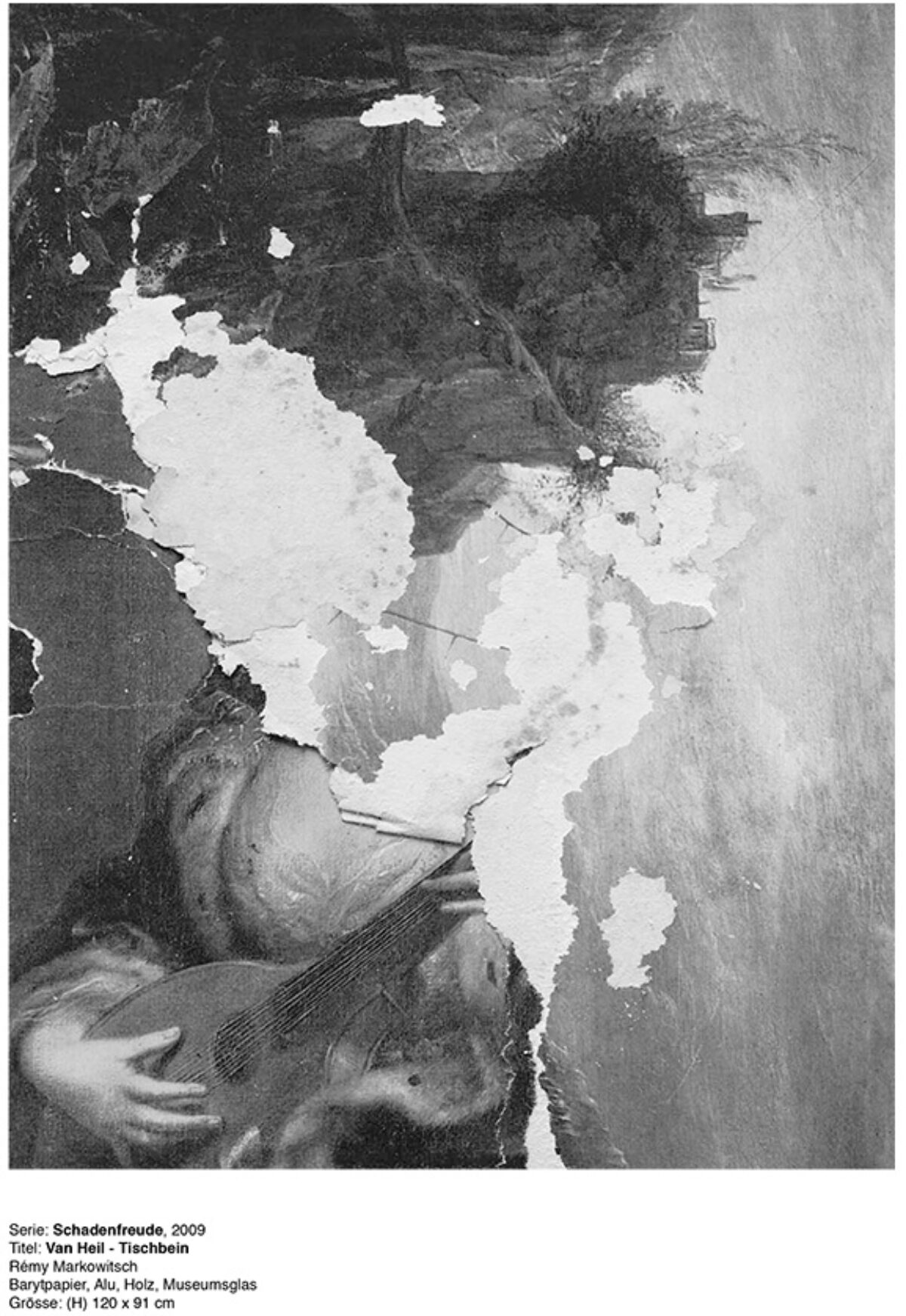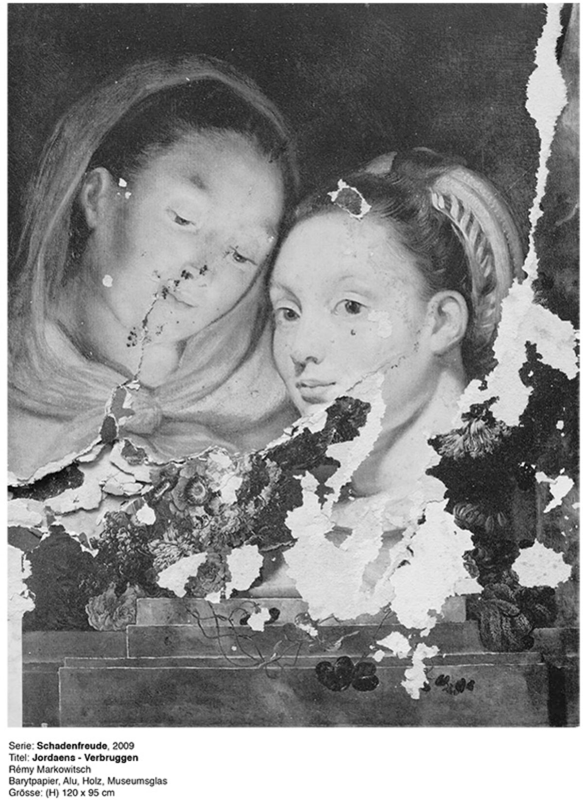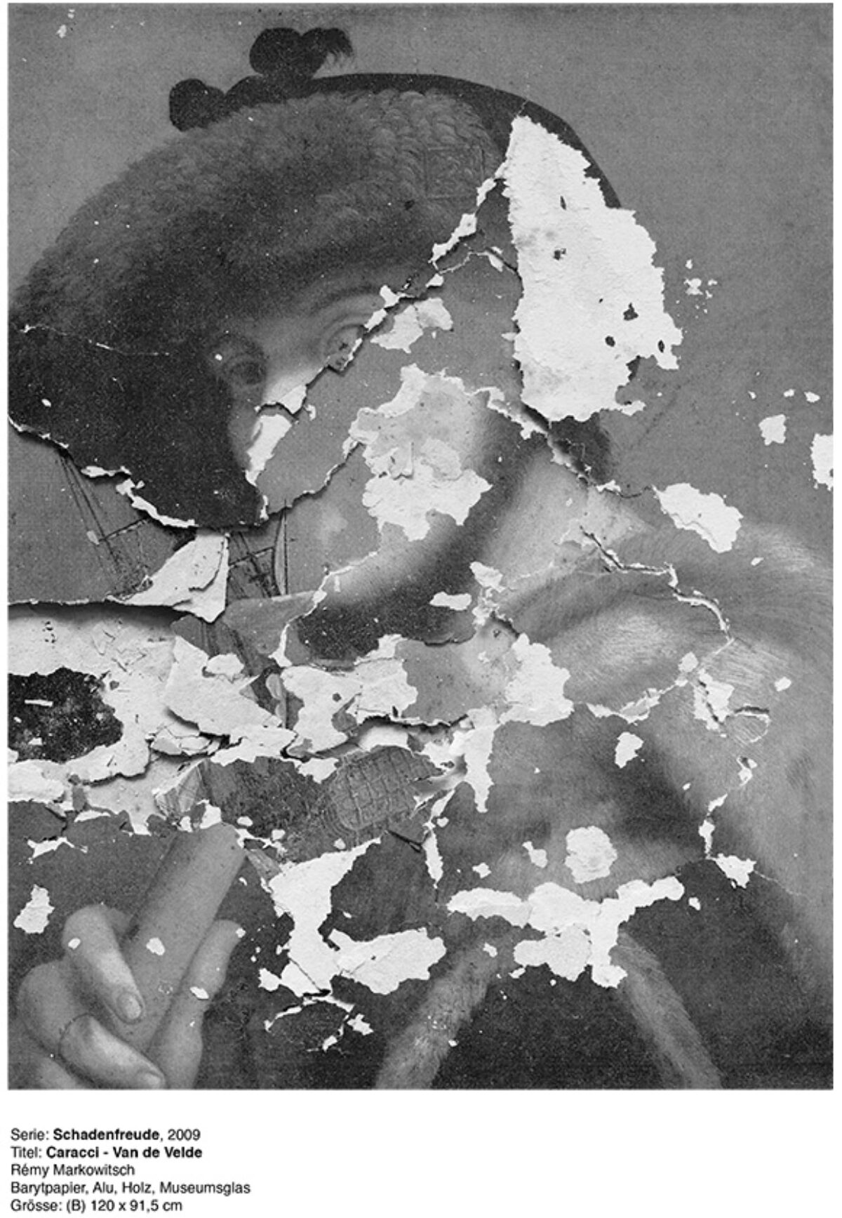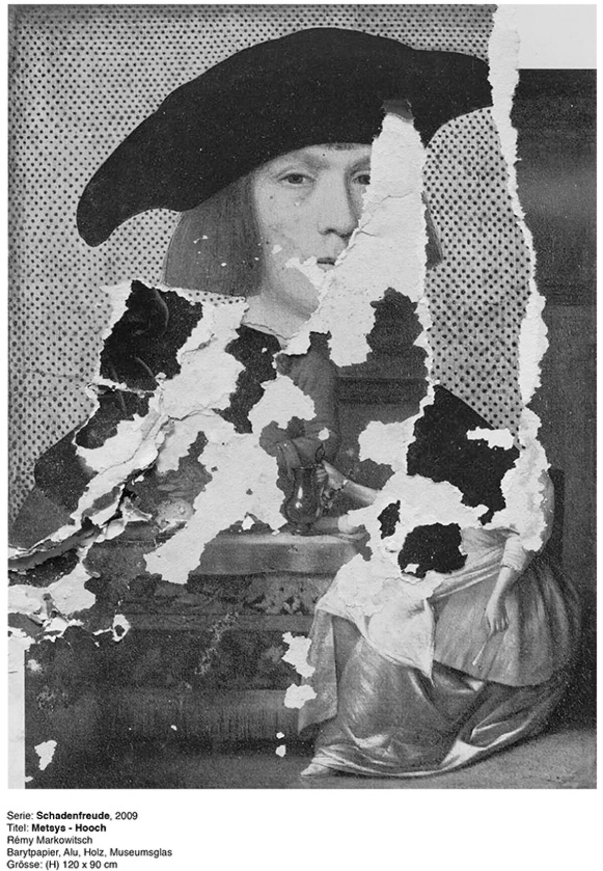 Alle Collagen enthalten ein Moment von Zerstörung und Wiederaufbau. Fragmente aus unterschiedlichen Quellen fügen sich zu einem neuen Bild zusammen. In Rémy Markowitschs Kaufmann (Talmudgelehrter) ist der Aspekt der Zerstörung deutlich sichtbar. Die visuelle Oberfläche des Bildes wird durch unregelmäßige Rissspuren und zerfetztes Papier geprägt, während die materielle Oberfläche homogen erscheint. Das gesamte Werk ist von einem fotografischen Firnis überzogen – wie eine Wasserschicht über einem felsigen Grund. Die Fotografie ist eines von zwölf Bildern aus der Porträtserie Schadenfreude, deren Grundlage ein Auktionskatalog aus dem Jahr 1962 bildet. Doch die darin abgebildeten Kunstwerke wurden nicht durch künstlerische Eingriffe miteinander kombiniert. Vielmehr entsteht ihre Durchdringung durch eine ungewollte Zerstörung: Schimmel hat sich durch das Buch gefressen und dabei verschiedene Bildteile aus unterschiedlichen Seiten übereinander sichtbar gemacht.