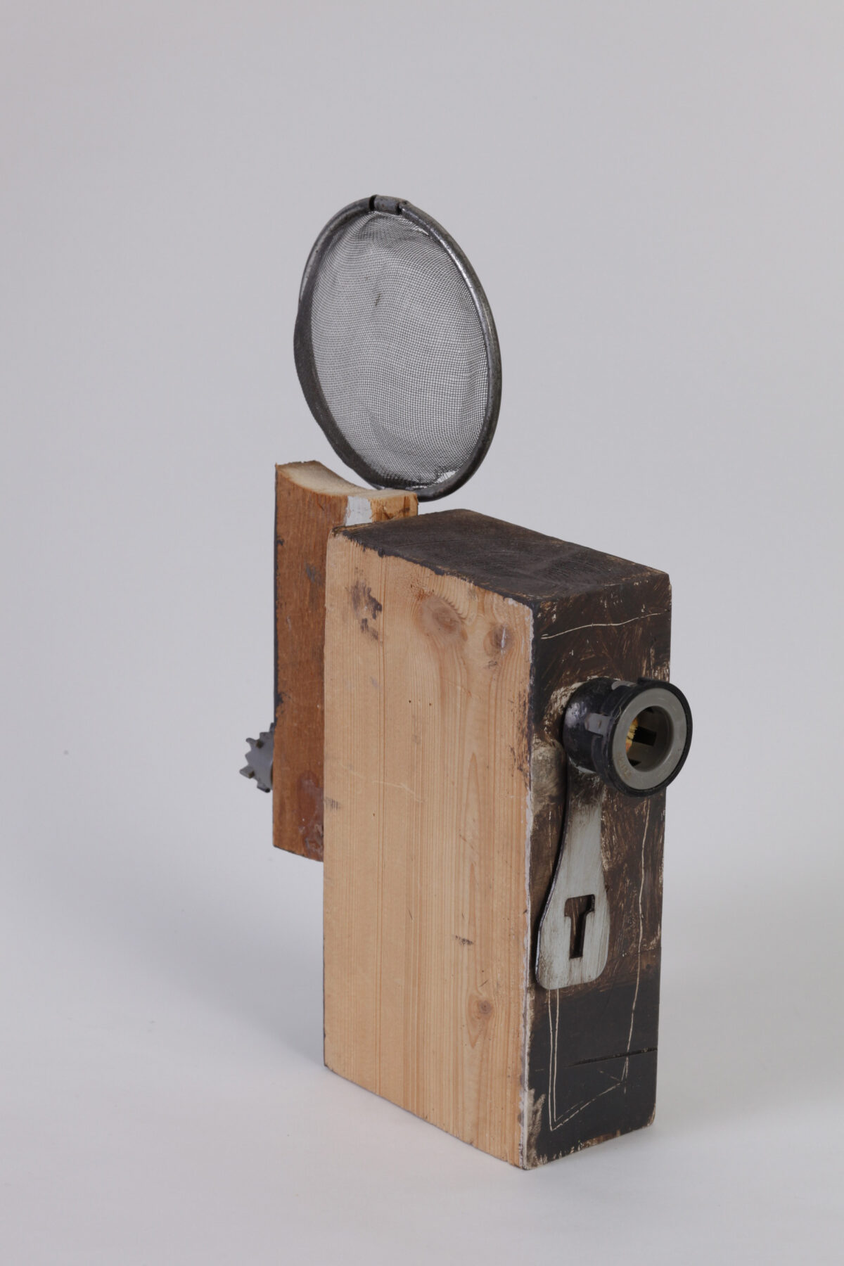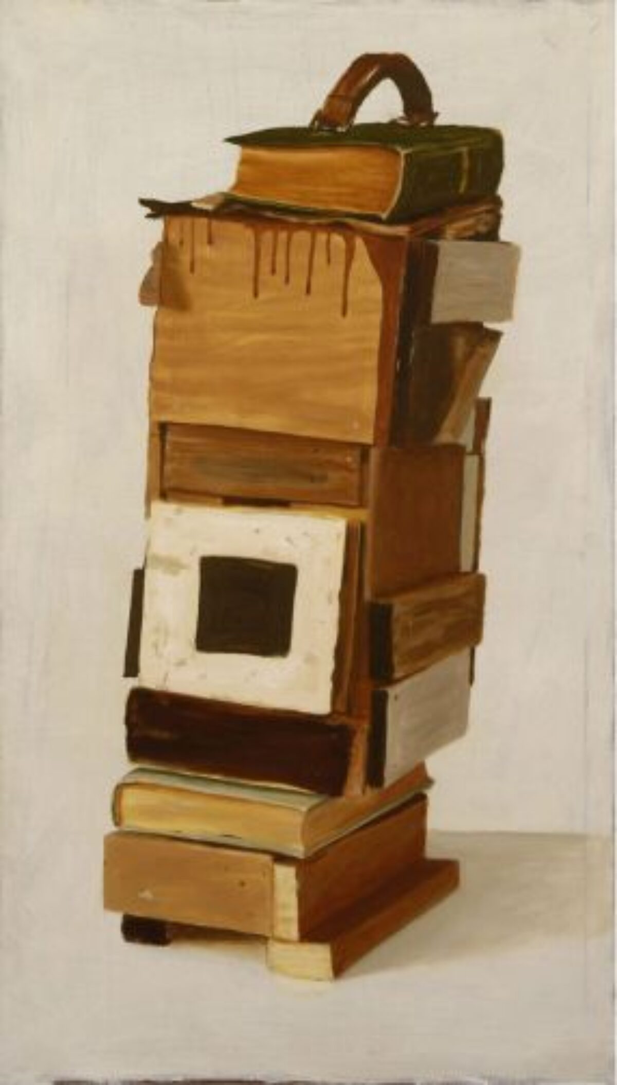 Very few contemporary artists have succeeded in expressing French post-structuralist Roland Barthes’ notion that photographs can freeze a moment and produce a memory as well as Andrei Roiter. In his work, this approach to “freezing” involves a whole process consisting of several steps. First, Roiter photographs utterly banal, random, often significantly worn items, or objects that he puts together himself from waste material such as old boards, moulding and wires, that he shapes from cement, or that he glues together from old paper. These objects he refers to as “props”. He then projects the photographs onto a canvas and creates a final paintings using oil or acrylic paints. Such an approach gives the painted objects the kind of coldness and distance that we know from the American photo-realist paintings of the 1960s—except that American photo-realism used bright colours and sharpness. Roiter’s subjects, by comparison, are submerged in greyish-black tones, as if lost in a haze in the way objects sometimes fade in and out of memory. And it is memories that Roiter is interested in. Since leaving his hometown of Moscow in the 1990s, he has lived in constant flux between Western Europe and North America. Travelling has become a permanent state of being. By contrast, home is a fictitious state that stays alive only through the fragmentary memories that appear in his paintings and installations: memories of shacks nailed together with wooden boards that children built as shelters, memories of waiting rooms —because a significant part of travelling is waiting for the next train, the next station —memories of things that once meant something, such as the Constructivist tower by the Russian artist Vladimir Tatlin. But in Roiter’s 2007 work Tatlin’s Chair, even this memory is distorted. It long ago stopped being an expression of cultural identity, even if traces of constructivism can still be found in the way he constructs objects. The suitcase is a traveller’s constant companion, and so we find it in Roiter’s works —alongside a book and a camera, two mediators of memories. This mediation and its close connection to memories are what fascinated Roiter when he first encountered Miroslav Tichý’s photographs of women. He also donated several of his own works: a camera made of cement, a camera mounted on a wall, and a painted picture of a camera.