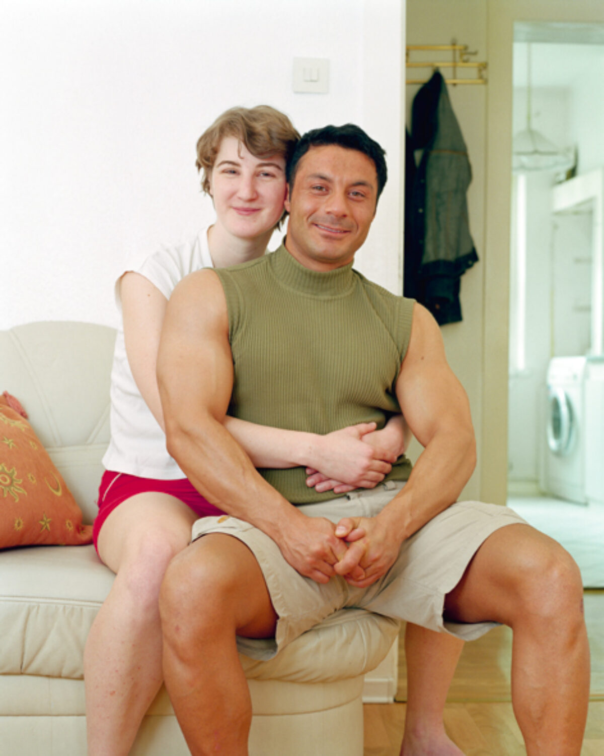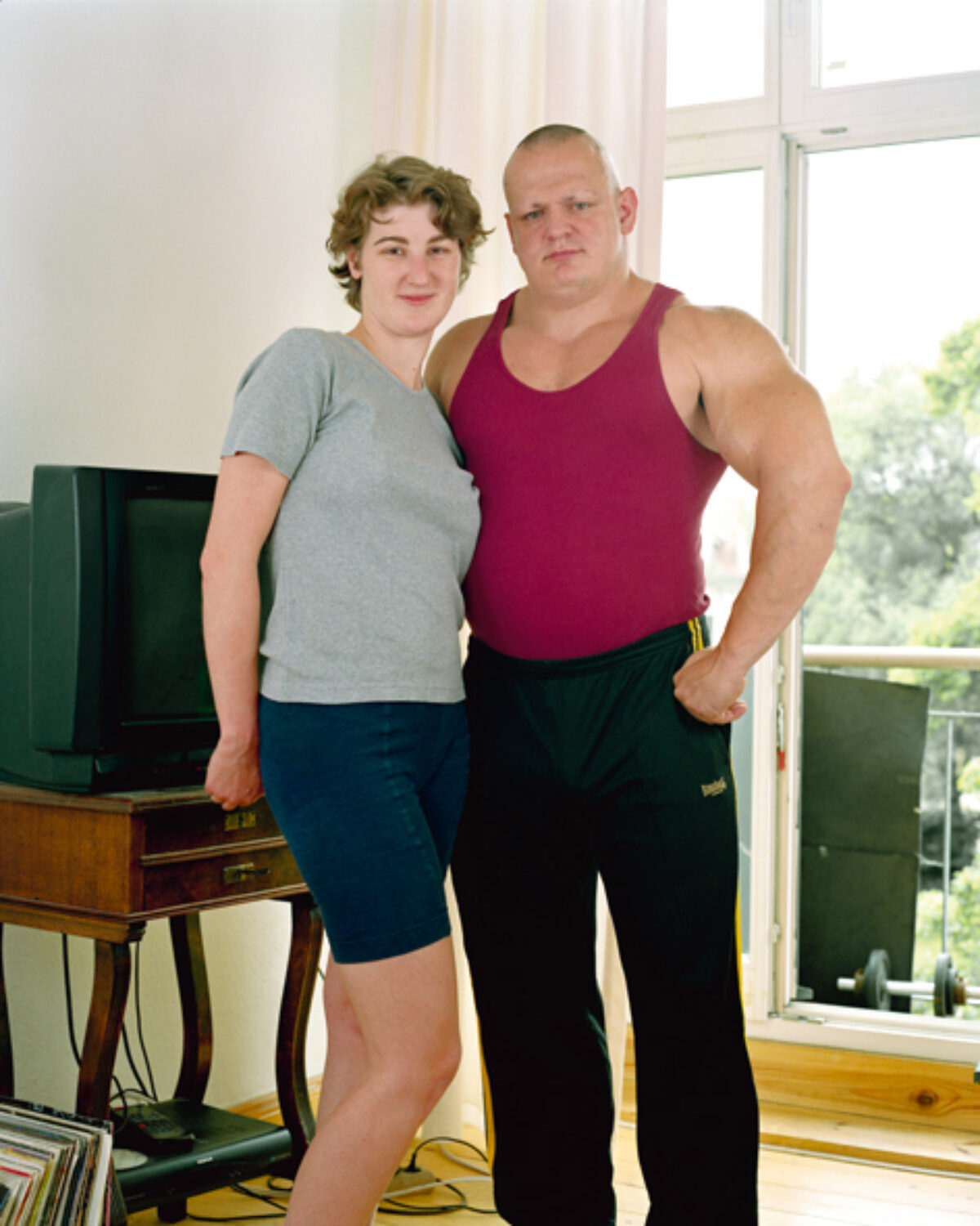In most European languages, the word “person” is derived from the Latin word persona, which means “mask”. German photographer Rabea Eipperle explores the extent to which the concept of person merges with that of a mask. In one of her series, she takes on the role of a girl called Nicole: “I was a simulation of this provincial girl. Actual experiences and memories are mixed with fiction.” The photographs depict a smiling and somewhat insecure young girl standing by the trunk of a car, holding a heavy case of beer. Are we ourselves, or does how we behave, how we move, our body language, and how we present ourselves to the camera have nothing to do with being natural and authentic? Is our behavior really just a mask that we put on, something taken from advertising, movies or television? Eipperle asks the fundamental question as to who we actually are—for instance, in her series Wir (We) from 2009. In the small German town of Soest, she randomly approached young people on the streets and asked them to let her take group portraits of them. How do these young people, placed before a neutral background, present themselves to the camera? Almost never naturally. Their attempts to strike poses that they know from advertisements and fashion magazines are impossible to ignore: they stand unnaturally with legs apart, awkwardly cross their arms, tilt their heads back, and have frozen expressions on their faces. Elsewhere, Eipperle plays with the wellknown motif from magazines and advertisements in which sexy women pose in front of shiny cars. In her pictures, however, it is the car’s owner standing in front of his wheels —completely naked. These men responded to an ad that Eipperle places in a nudists’ magazine, and thus voluntarily provided their bodies like trained models. This series from 2006, entitled Unbekleidet mit Auto (Undressed with Car), breaks down stereotypes related to our association of masculine pride with cars. In the series Mit uns ein Gefühl (With Us a Feeling), Eipperle photographs herself with the ultimate symbols of manhood—bodybuilders. Whether they are seated, standing, or embracing, their roles are always clear: he, with heroically flexed chest and a victorious expression on his face; she, practically transformed into captured prey, smiles guilefully. Eipperle’s photographic works demonstrate quite convincingly that “person” may truly just mean “mask”.
