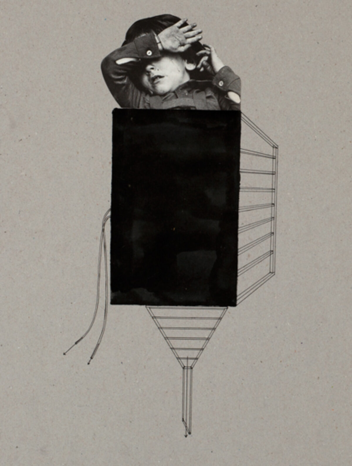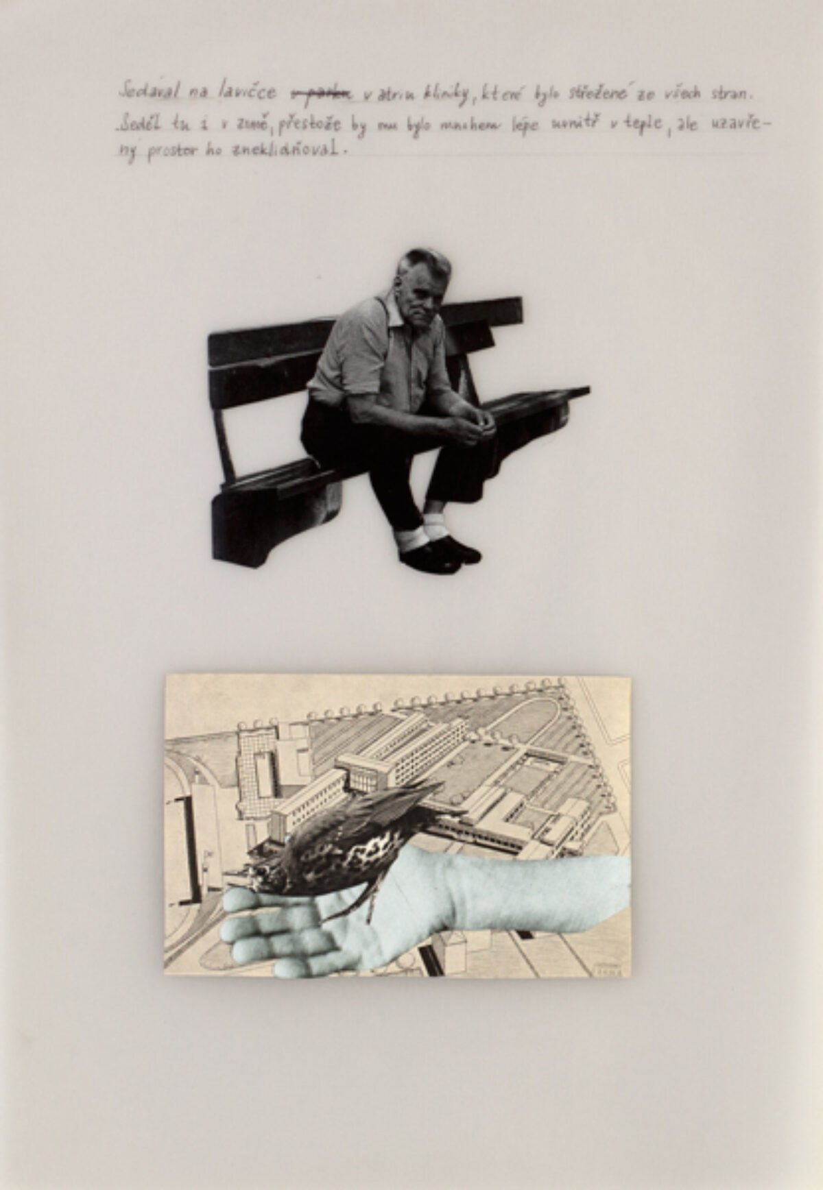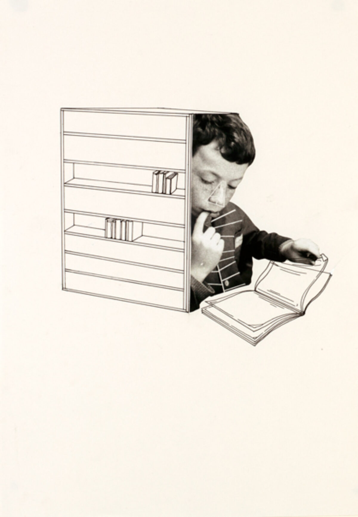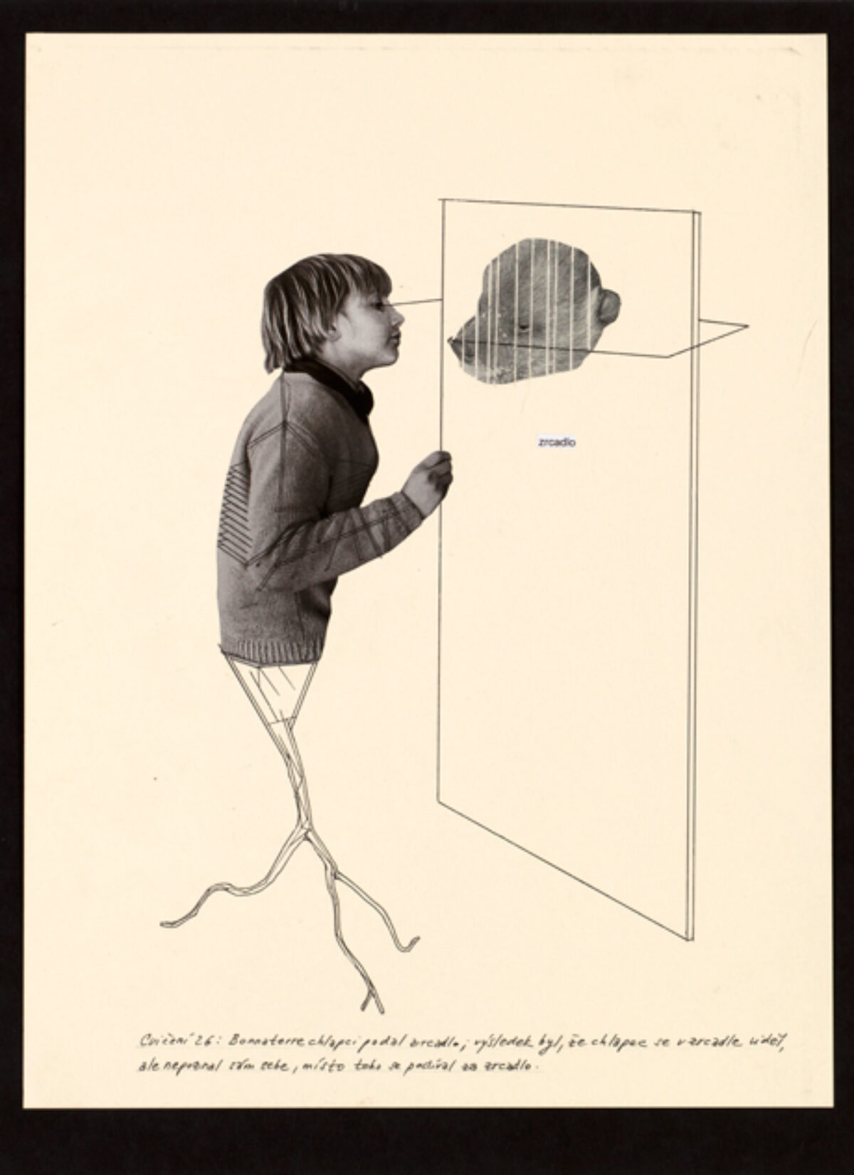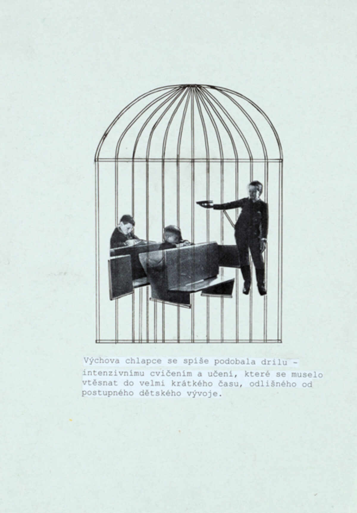 After Koťátková had dealt with the space in her inherited flat, she took up the topic of travelling to school, which for most children is the first independent experience with space outside their home. She made a schoolbag out of wood and took her former route to school accompanied by a camera. Then in front of the school, she buried herself knee deep in dirt. Some of the children who curiously gathered around imitated her. In 2008, the film was a part of an exhibit entitled “The Way to School” at the Prague Špála Gallery, along with drawings reminding us of textbook illustrations and other films with children sitting in wooden structures similar to cages or at a table with their hands behind their back. These films appear horrifying and grotesque at the same time – like all attempts to control and adapt a child’s body to the needs of everyday life. The films portray the lifelong conflict between discipline and the body’s desire for movement, light, air and knowledge, as expressed by a child’s primordial state of being.