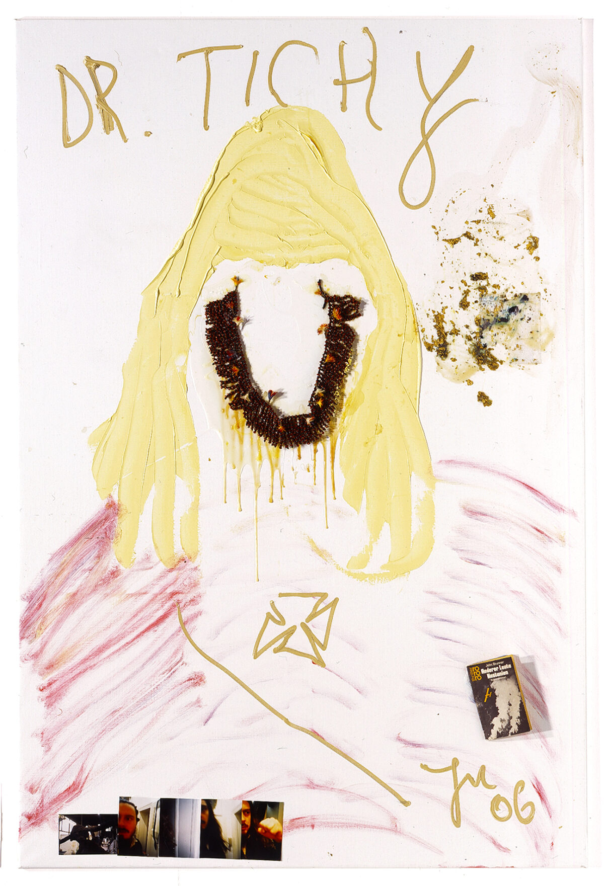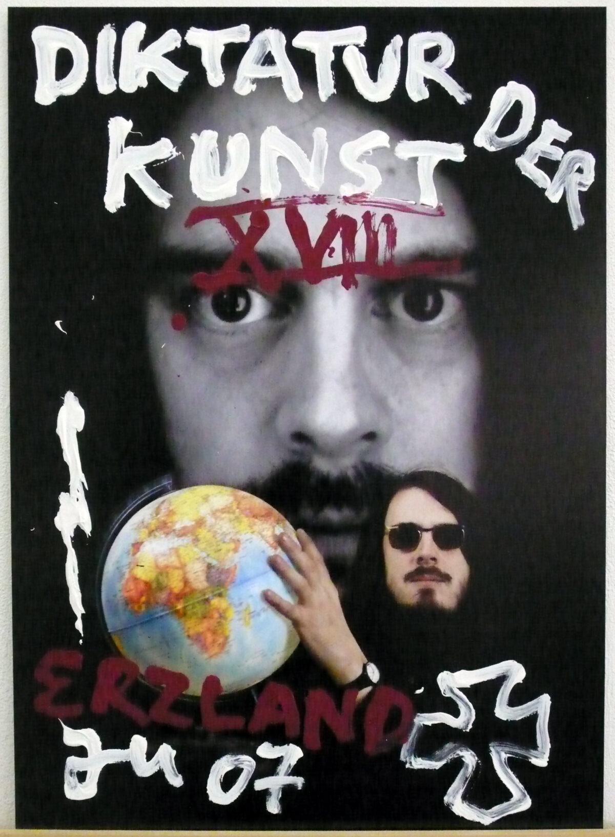 Jonathan Meese is one of the few artists who still manages to cause disturbing controversies. Adversaries see an uncritical, almost dangerous admirer of megalomania and authoritative or despotic structures. On the other hand, advocates appreciate him for his ability to confront various forms of evil without any ethical inhibitions. Evil seems to attract this artist, and so he does not hesitate to use the Nazi salute in his performances. Of course, it is not only Hitler who figures in to his unconventional creations. From the very beginning, he has dealt with such characters as the Marquis de Sade, a notorious advocate of evil, or Stalin. During his productions, Meese sings, cites Nietzsche, Hegel or Wagner, howls, gets down on his hands and knees, undresses and dresses, spits, and hysterically yells until he is exhausted. They sometimes last for hours and are very demanding even for the audience. They are played on Meese’s sets that are painted and plastered with portraits of these characters along with clippings from porno magazines and famous publications, especially those by German philosophers. However, rather than theatre, these productions appear to be more like a chamber of horror, which is naturally closer to the author’s phantasmagorical behaviour. Therefore, it is no surprise that Meese has several times been requested to do theatre staging or even performances at the Berlin Volksbühne theatre.
