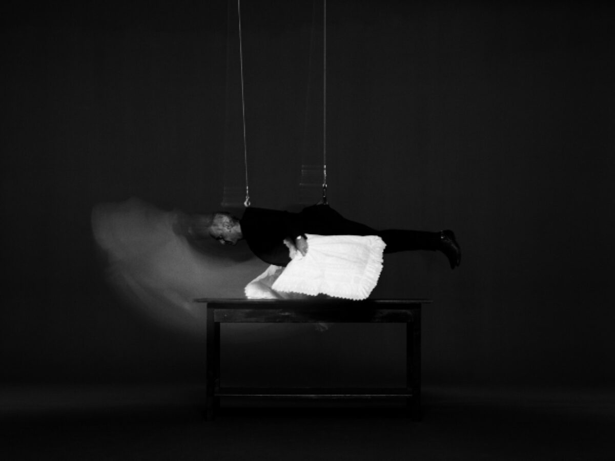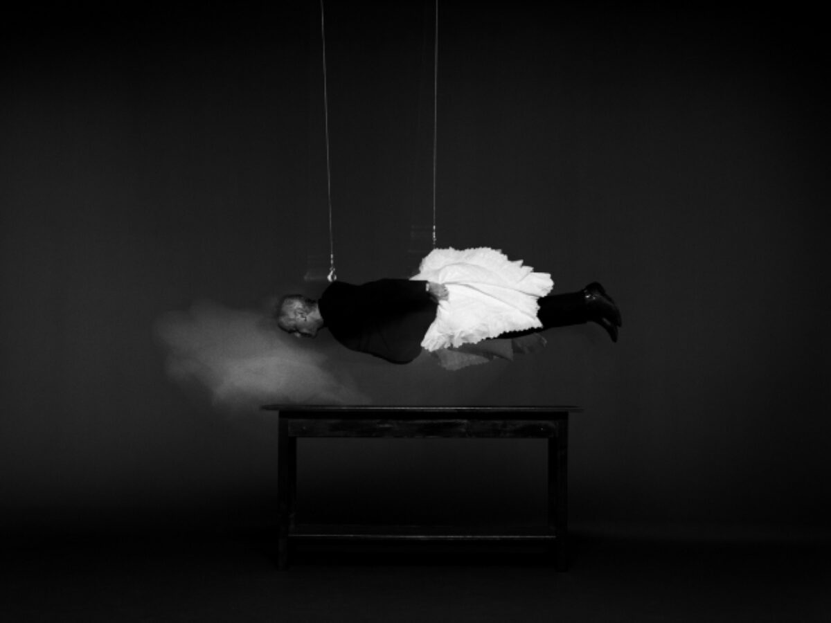 Klauke appears in photos nude or only in women’s stockings, or as in the series “Self-Performance” from 1972/73, in a woman’s dress, a veil, and white lilies with a frivolous expression, painted face, and obscene crotch padding. In provocative photos, he is dressed in seductive women’s lingerie with a suspender belt, though with a bishop’s mitre on his head and a staff in his hand. Similar commotion was created by his series “Dr. Miller Sex Shop oder So stell’ ich mir die Liebe vor” (Dr Miller’s Sex Shop or This is sort of how I imagine love) from 1977, where he dresses in accessories and sticks various objects from sex shops in his mouth and other orifices. Confirmation of his expression can be found in the theories of the French philosophers Gilles Deleuze and Félix Guattari relating to the “lust machine”, which Klauke understands more as a machine of deficiencies, or as he puts it, “most of my yearnings are the result of infinite prohibitions as well as hopeful, prying fantasies. What would happen if I could do what I desired? To put it in formal German: ‘Immediately fuck the whole world, from the front and the back, and when I am finished, I’d do it again.’”