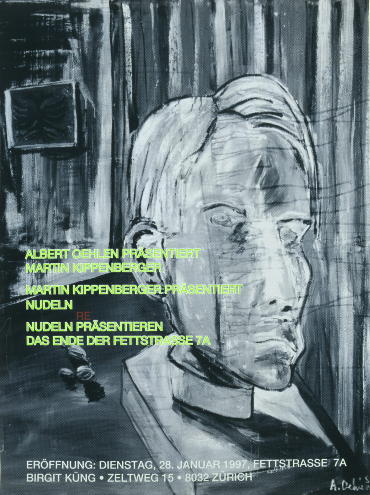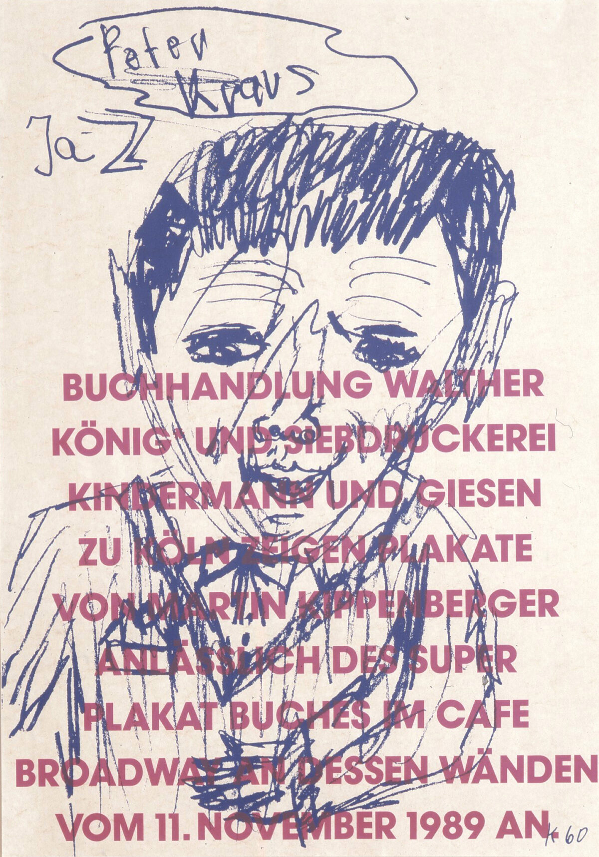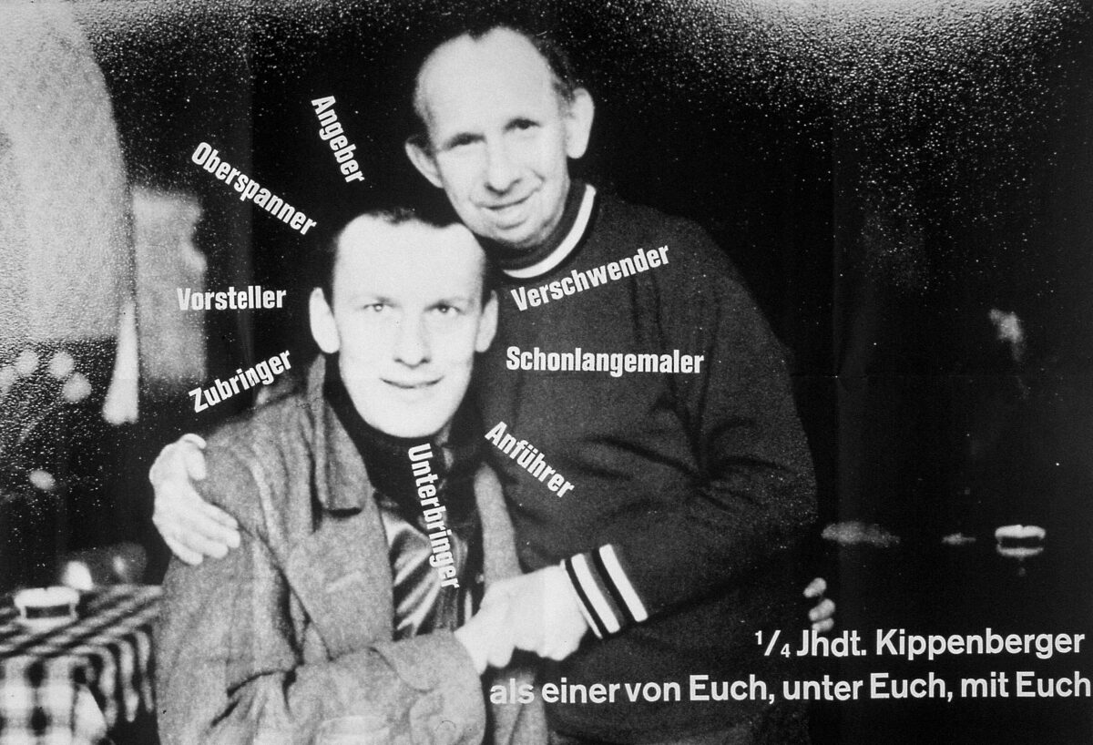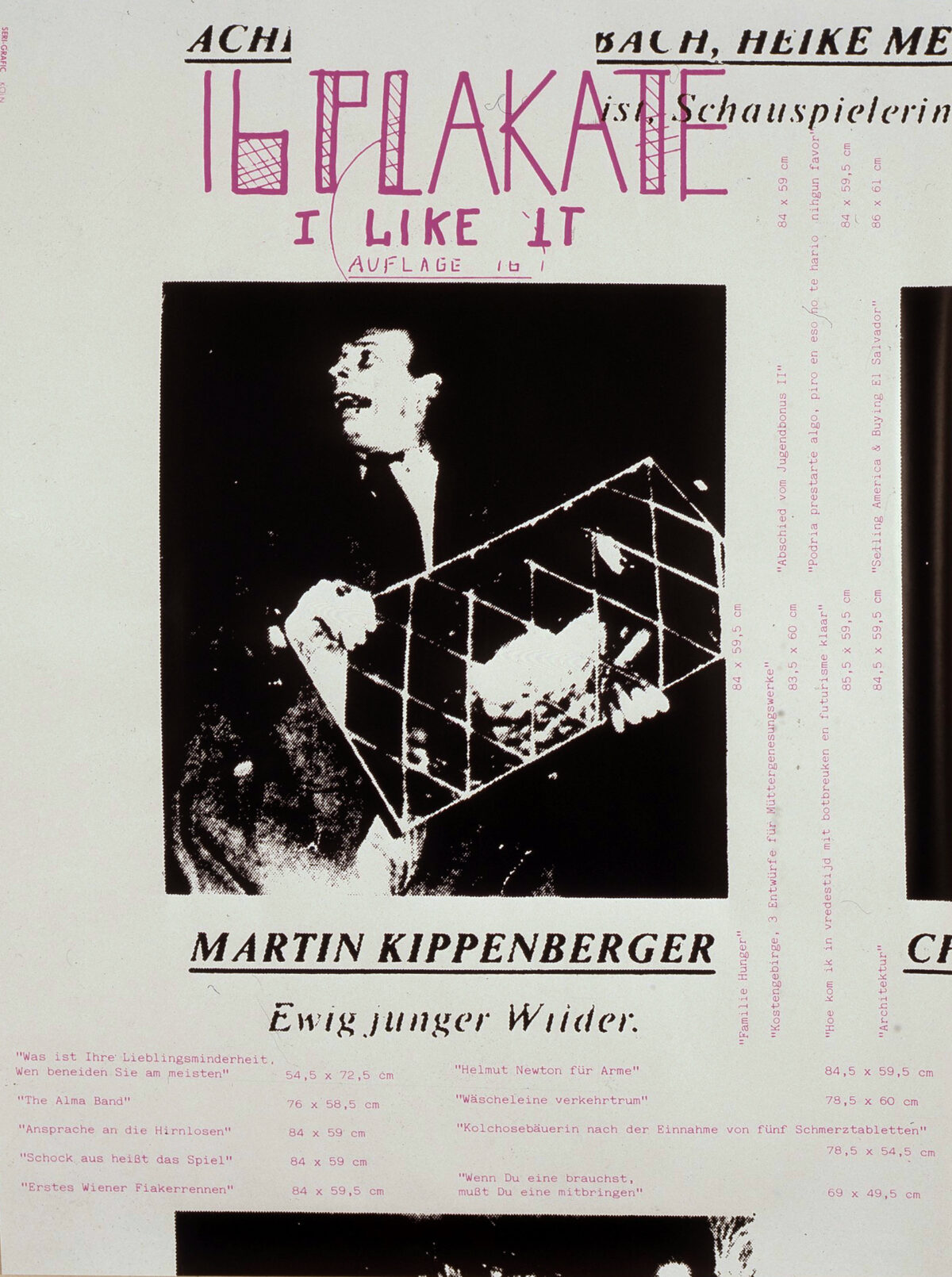 Influenced by these experiences, Kippenberger was more than capable of balancing between intellectually intense thinking and staged absurdity, aggression, disgust, and awkwardness. Some of the titles include “Heute denken – Morgen fertig” (Think today – tomorrow ready) or “Durch Pubertät zum Erfolg” (From puberty to success), appearing on these posters which he thought were just as important as his pictures and installations. Kippenberger would have also undoubtedly agreed to exchange his posters with the Tichý ocean foundation, as permitted by the co-founder of “Büro Kippenberger” and manager of the artist’s endowment, Gisela Capitain.