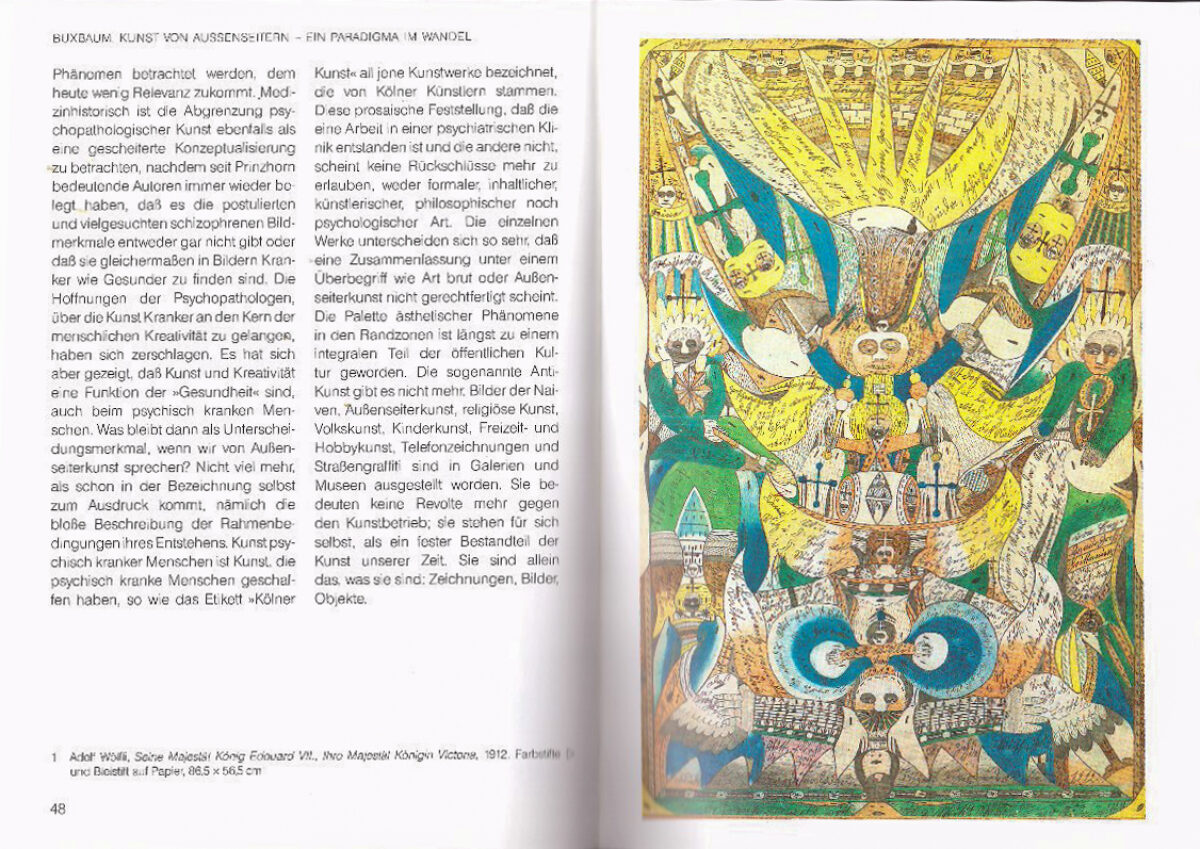 Die Kunst psychisch kranker Menschen hat der Avantgarde zu Beginn unseres Jahrhunderts wichtige Impulse gegeben. Nur wenig später wurden beide, Künstler und Geisteskranke, vom nationalsozialistischen Regime als ›entartet‹ verfolgt. Heute, in der Zeit postmoderner Rezeption, ist im Bereich der Kunst die Frage nach krank oder gesund obsolet geworden. Der Dialog mit den Außenseitern gewinnt eine neue Dimension.